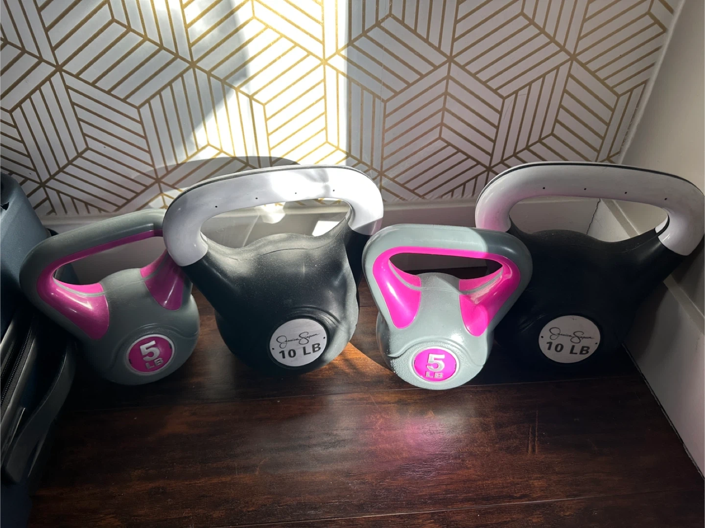 Set of two kettlebells, one 5 lb and one 10 lb, from Jessica Simpson. They have grey and pink handles with black bases. These are great for at-home workouts!