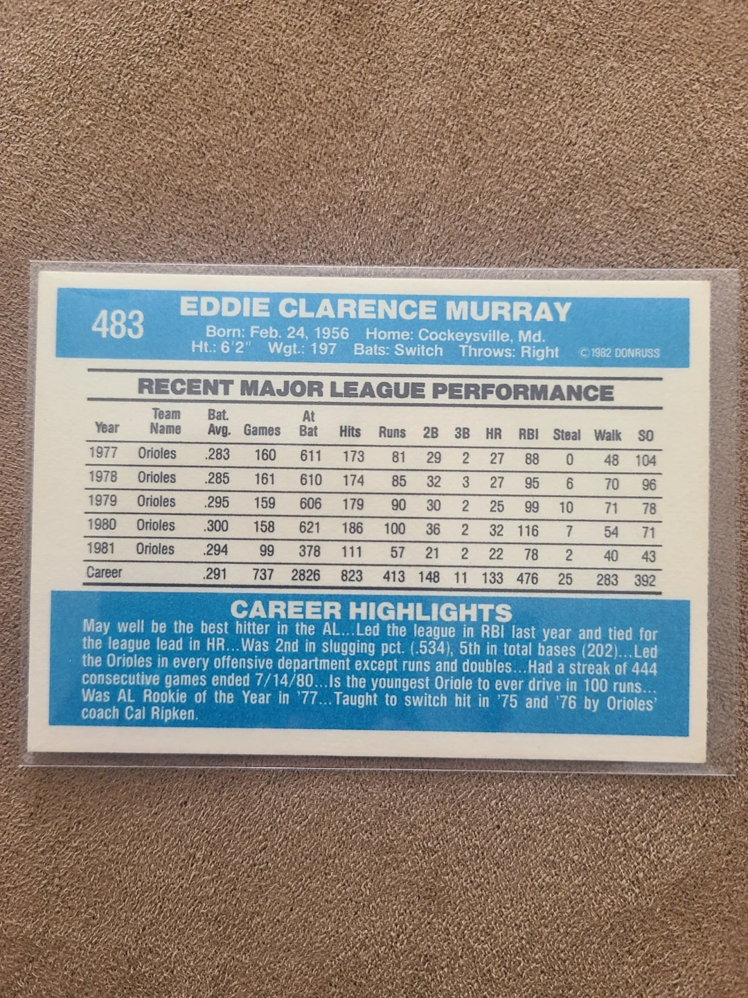 This is a 1982 Donruss baseball card featuring Eddie Murray. The card shows his recent major league performance stats. It also includes career highlights.
