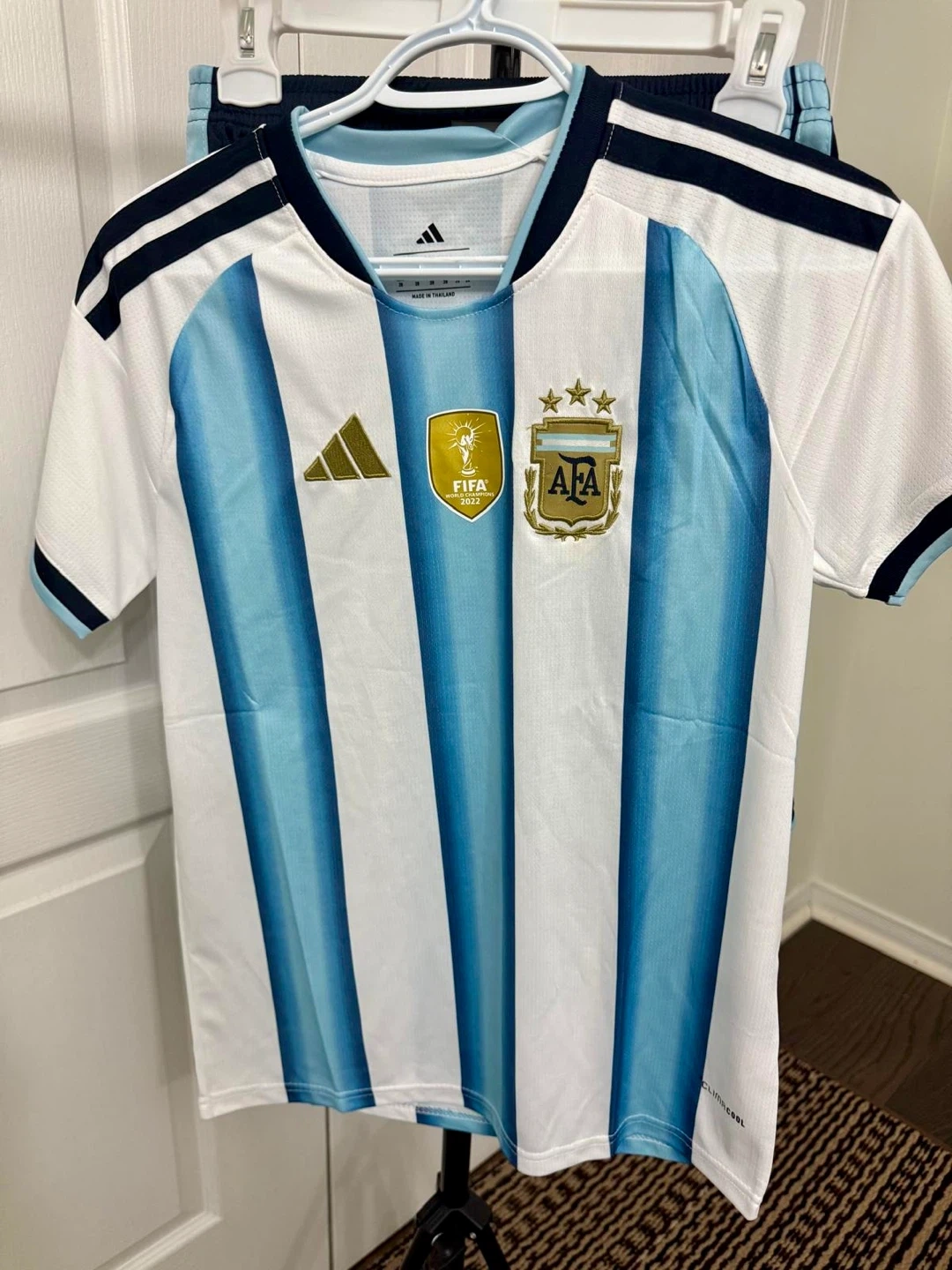 Soccer jersey Argentina's 2022 FIFA World Cup win. Features the team's classic sky blue and white stripes, gold FIFA Champions 2022 badge, and the AFA crest. Made with ClimaCool fabric for breathability. This shirt is great for any soccer fan!
