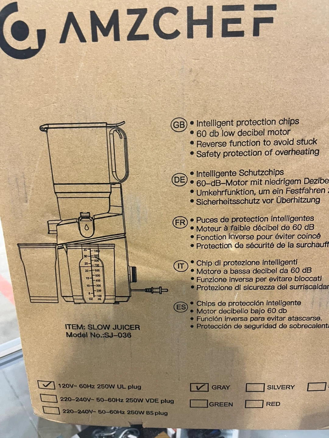 Looking to sell my Amzchef Slow Juicer, model SJ-036! It's great for making healthy juices from fruits and vegetables. It has a large capacity of 2000ML (70oz) and a 5.3 inch feed chute, so you don't need to pre-cut your ingredients. It also features a reverse function to avoid overheating. It comes with the user manual and original box!
