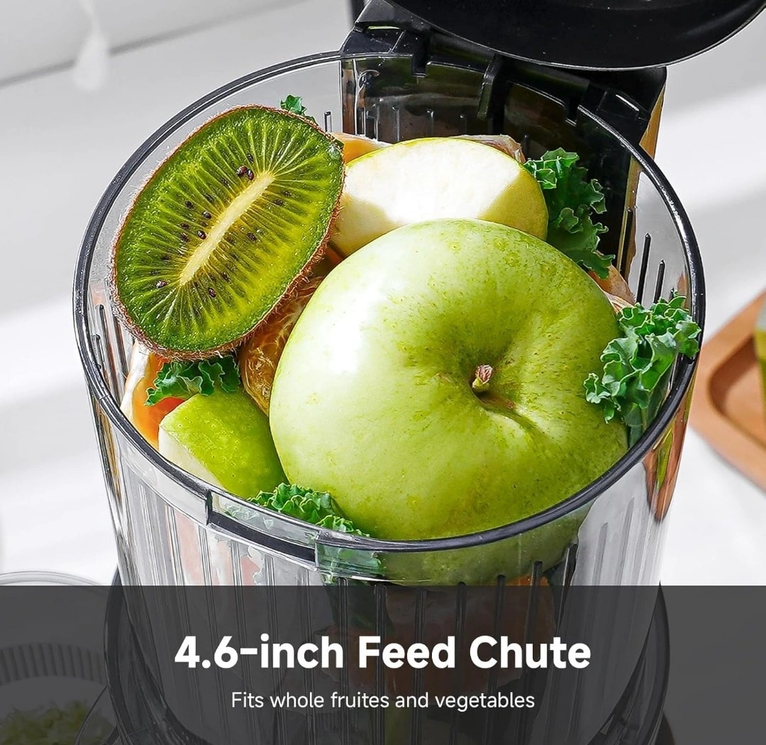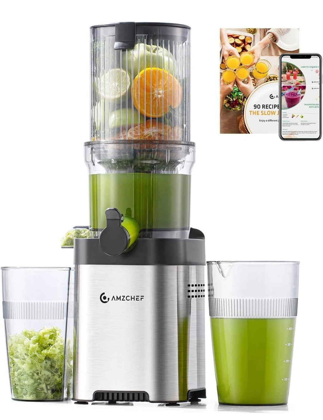 229This AMZCHEF slow masticating juicer features a 4.6-inch feed chute, perfect for whole fruits and vegetables. It has settings for both coarse and fine juicing. The juicer also boasts a one-click switch for forward and reverse operation, a pure copper motor, and operates with lower noise and more efficiency. Dimensions are 16.5-inch height, 7.0-inch width, and 5.8-inch depth