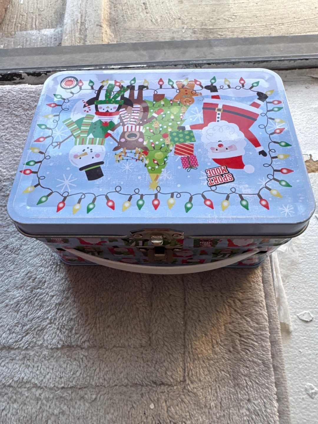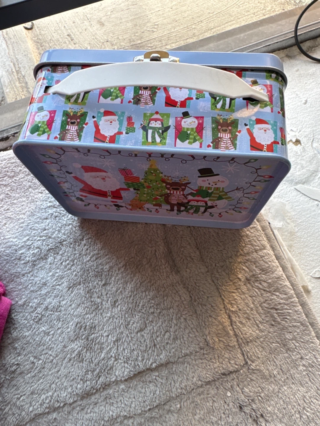 This is a festive Christmas tin lunch box. It features a colorful design with Santa, snowmen, and reindeer. The tin has a hinged lid and a carrying handle. It's great for storing small items or as a decorative piece during the holidays!