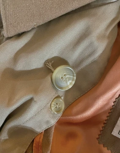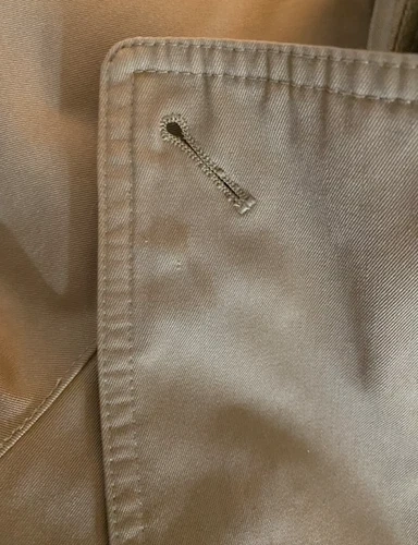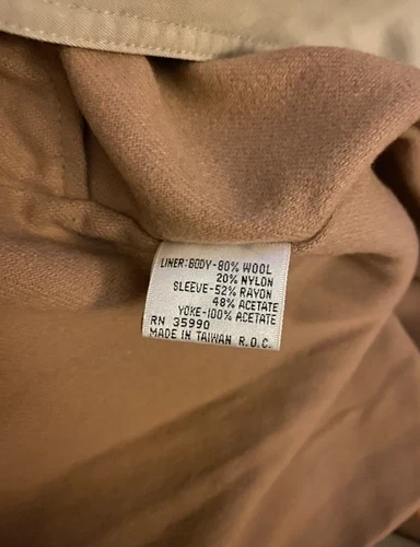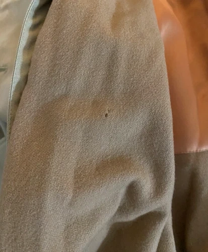 Pre-owned in good condition with a small stain on the inside of the right lapel, small tear on the inside of the right wool lining, and a loose button on the upper right inside corner. Slight wear and tear on the buckles. Size unknown but fits like an 8-10.