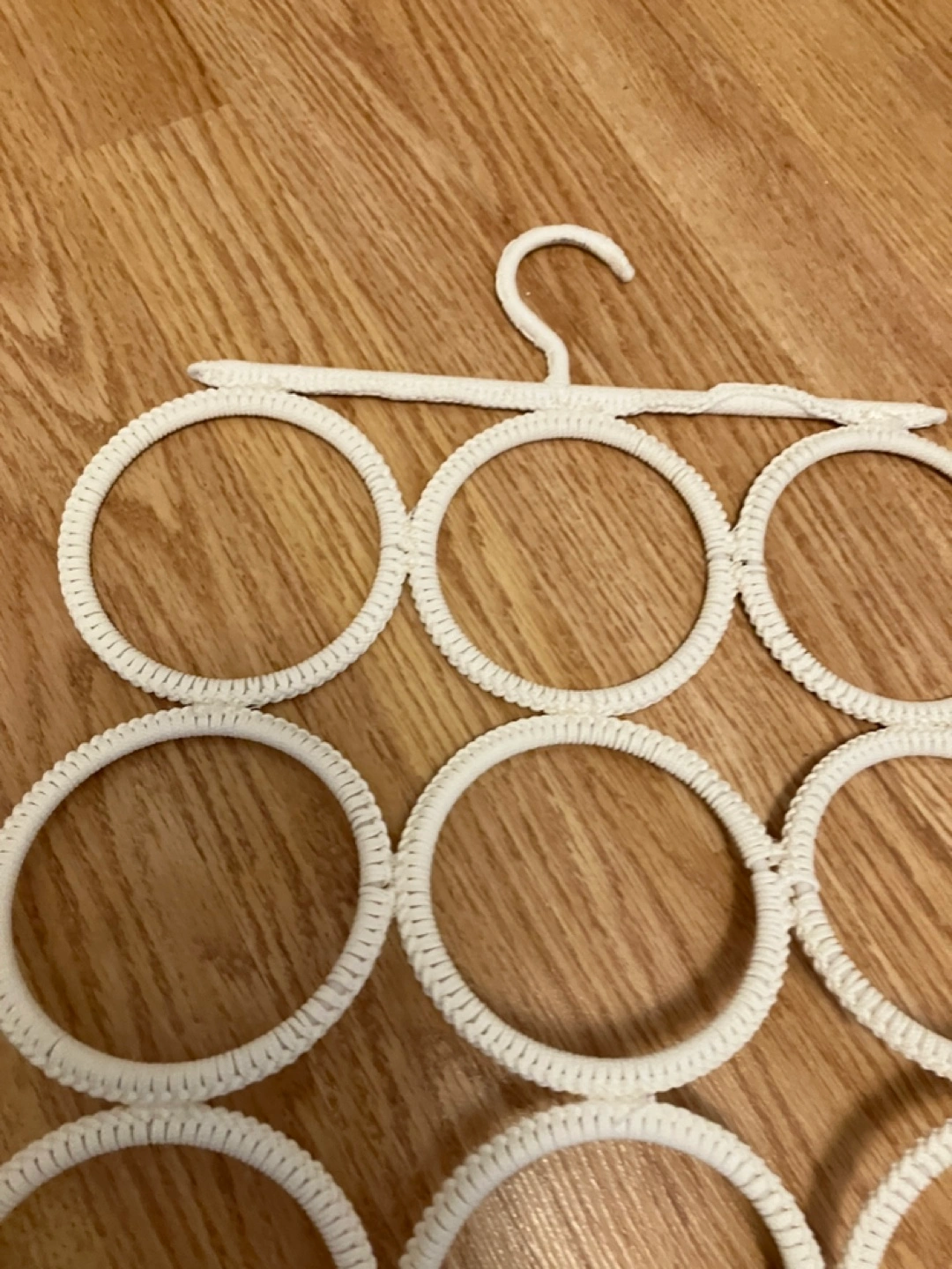 White multifunctional hanger. Great for organizing scarves, ties, or other long accessories. Lightweight and easy to use, can hang in your closet