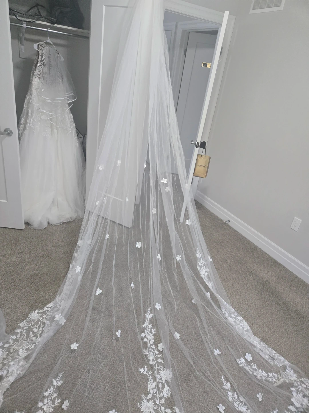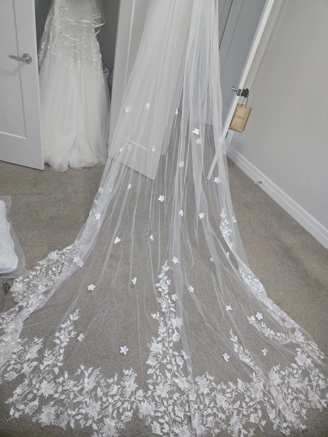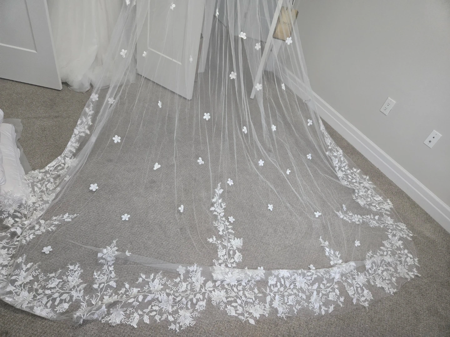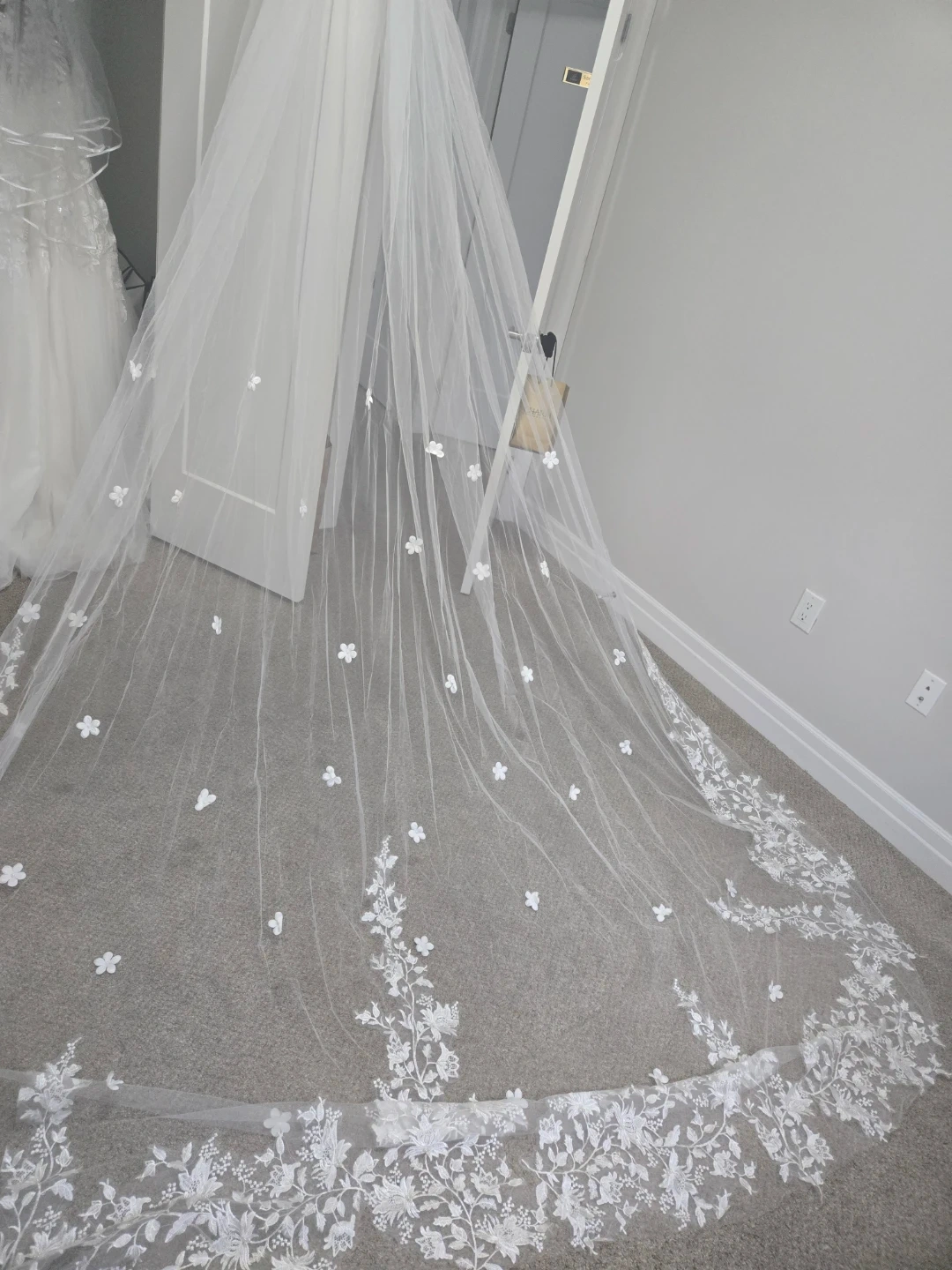 This is a beautiful white wedding veil adorned with intricate floral lace along the hem and scattered 3D flowers throughout. It's crafted from a delicate tulle material. Perfect for a bridal ensemble!