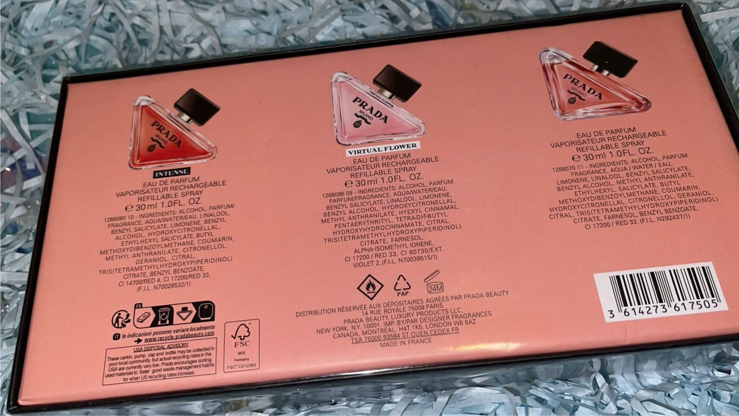 This set includes three 1.0 fl. oz. refillable sprays of Prada Paradoxe Eau de Parfum. The packaging indicates it's for vaporisateur rechargeable / refillable spray. It's a great way to experience the fragrance. Luxury Mini Perfumes Available β¨
