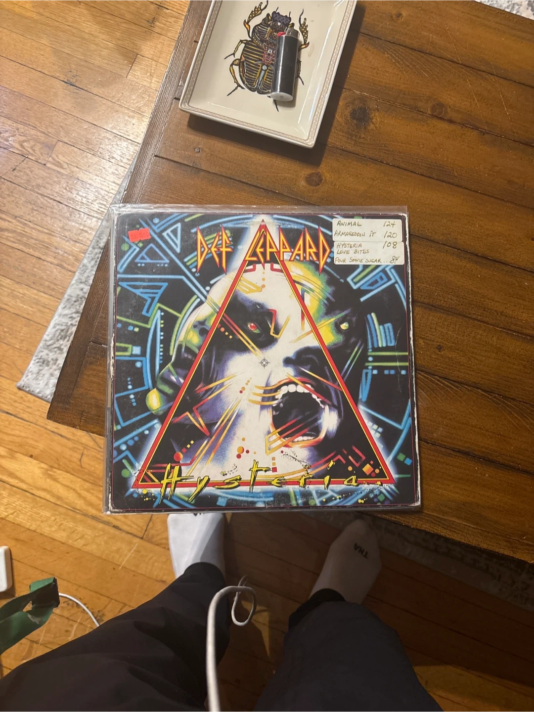 Def Leppard's Hysteria vinyl record. Includes tracks like "Animal", "Armageddon It", "Love Bites", and "Pour Some Sugar...". A classic album for any music fan!