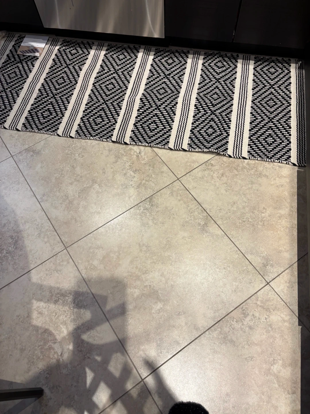 This rug features a classic black and white geometric pattern with striped borders. It's suitable for entryways or kitchens. Adds a touch of style to your floors!Pick up Lower Stoney Creek near Millen Rd