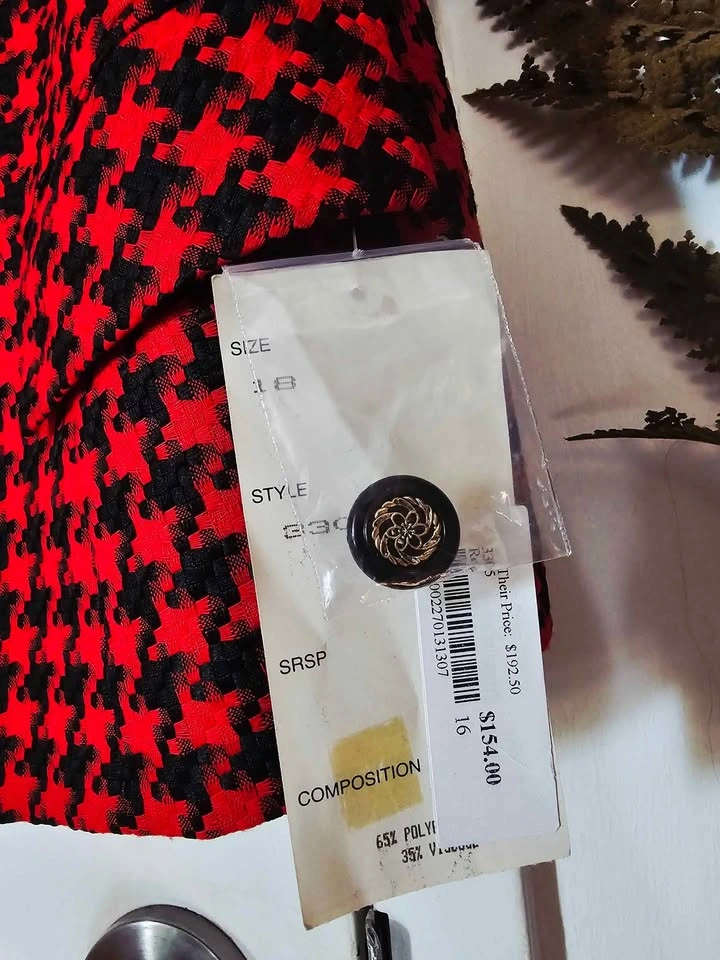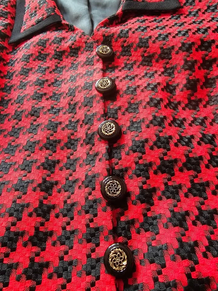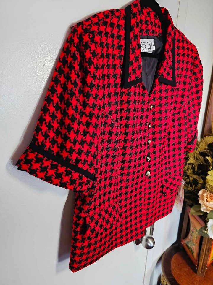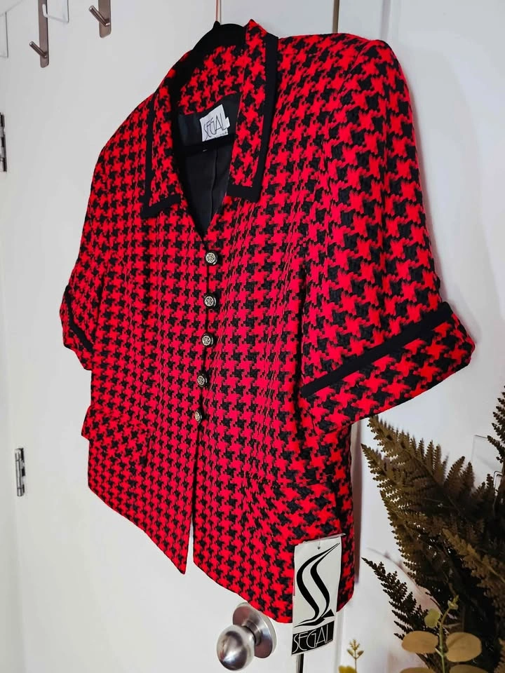 True vintage deadstock from the 1980s, brand new with tag and in new condition! This lovely short sleeve French style blazer jacket is made of a woven red and black houndstooth material, with black trim at the collar and sleeves and black and gold accent buttons. It has 2 flap pockets at the front, and is fully lined with a poly lining. It has shoulder pads that are sewn in under the lining. Blazer is made by Segal International, and it retailed for $154 in the 1980s, which is equivalent to almost $500 adjusted for inflation now. It is tagged as a size 18, but please check the measurements to be sure it will work for you. Pit to pit measures about 22", waist measures about 21", and shoulder to bottom hem measures about 24". semi-formal dressy dinner church business office