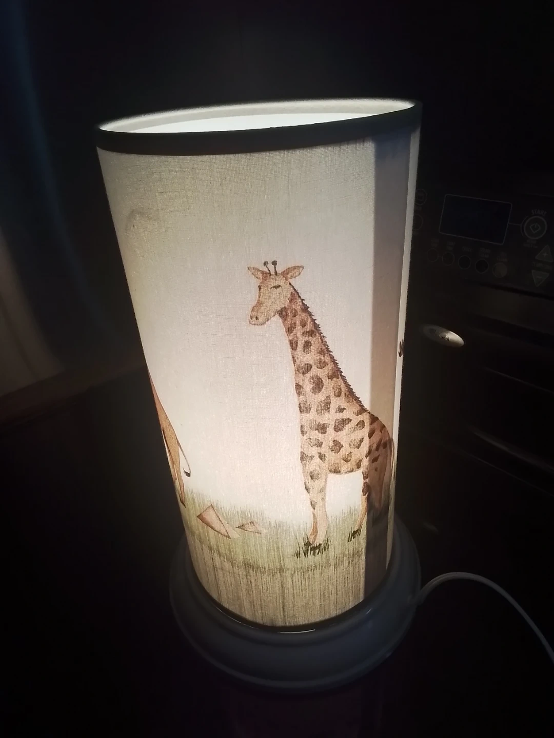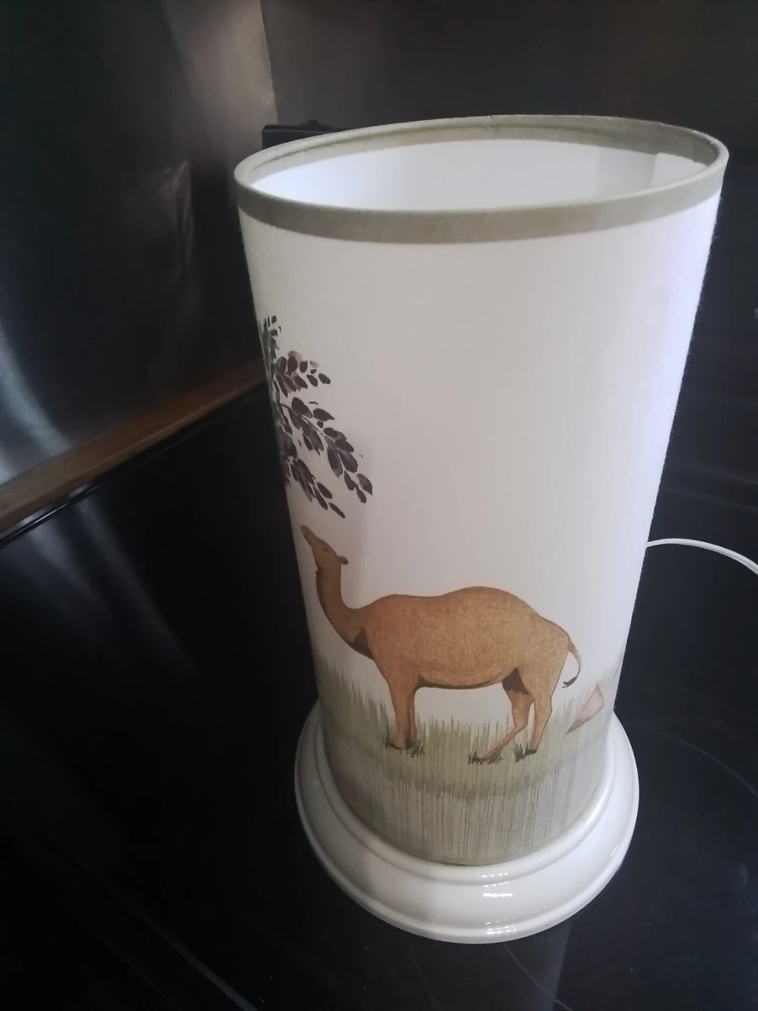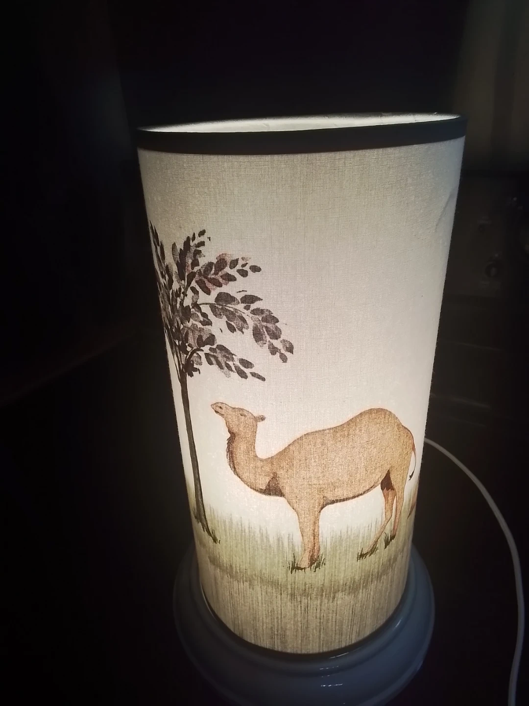 Brighten up any room with this unique vintage cylindrical table lamp, showcasing charming camel, moose, giraffe and tree designs, sized at 8x13.5 inches; it's in good working condition. This gently enjoyed lamp would love to find a new home.