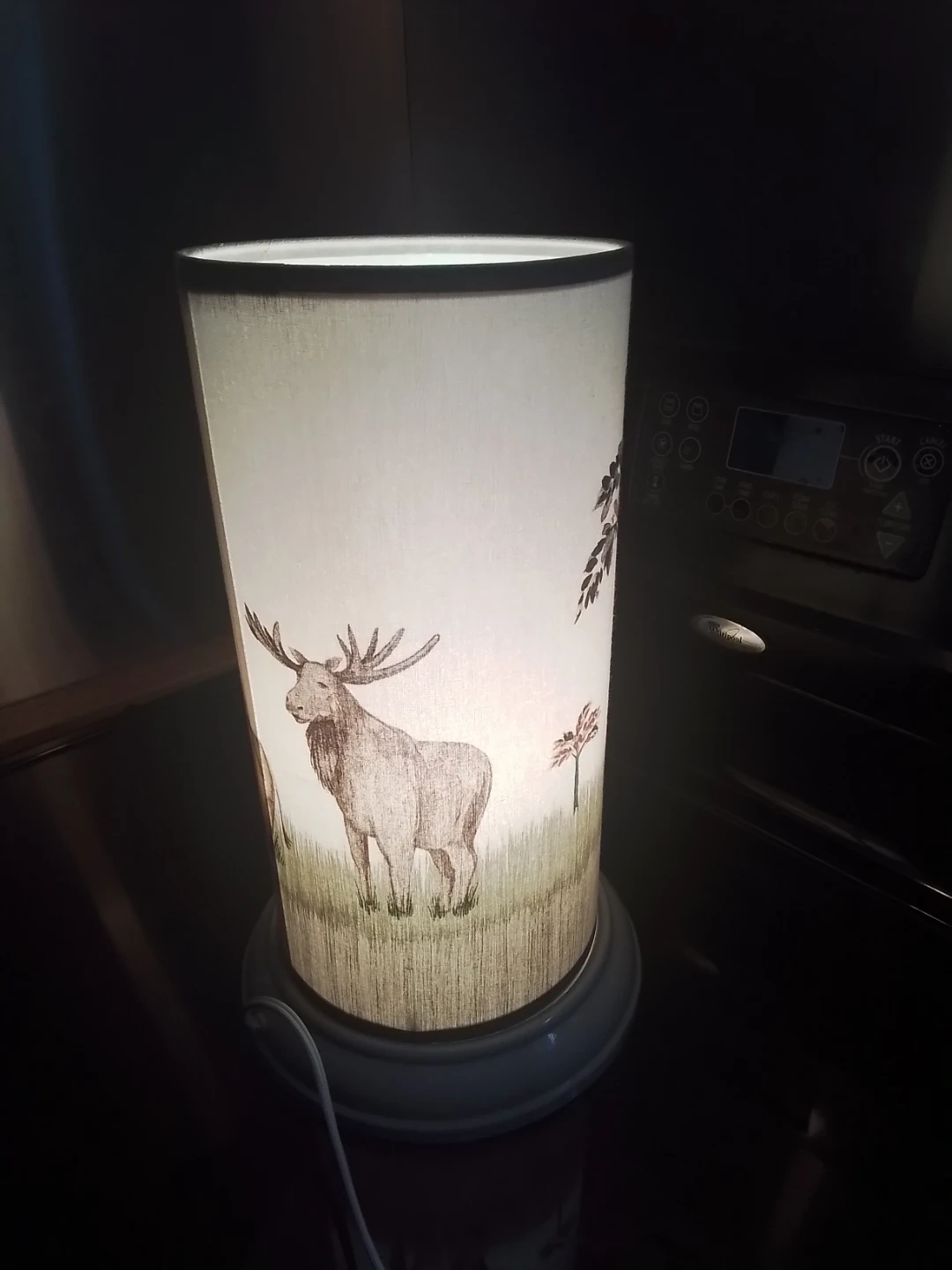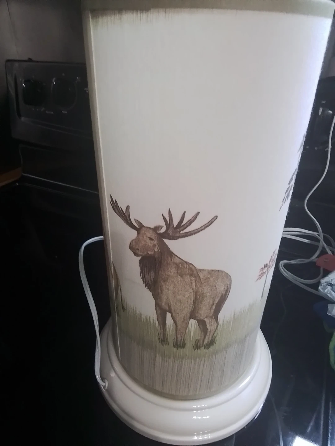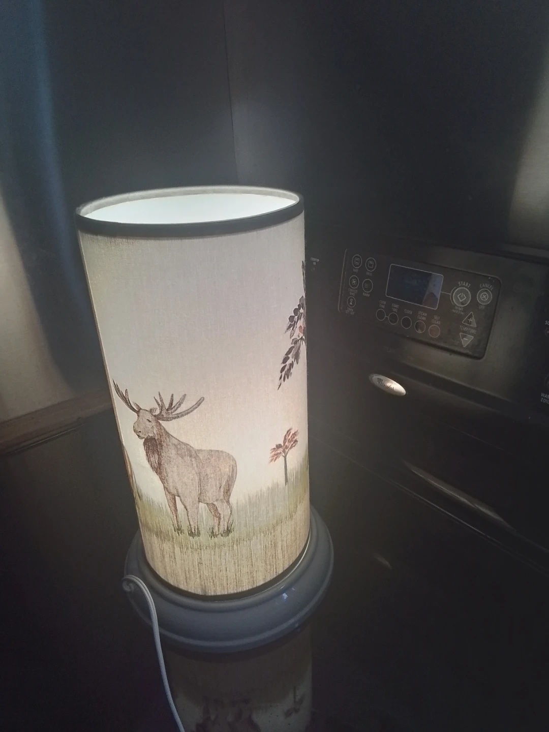 Brighten up any room with this unique vintage cylindrical table lamp, showcasing charming camel, moose, giraffe and tree designs, sized at 8x13.5 inches; it's in good working condition. This gently enjoyed lamp would love to find a new home.