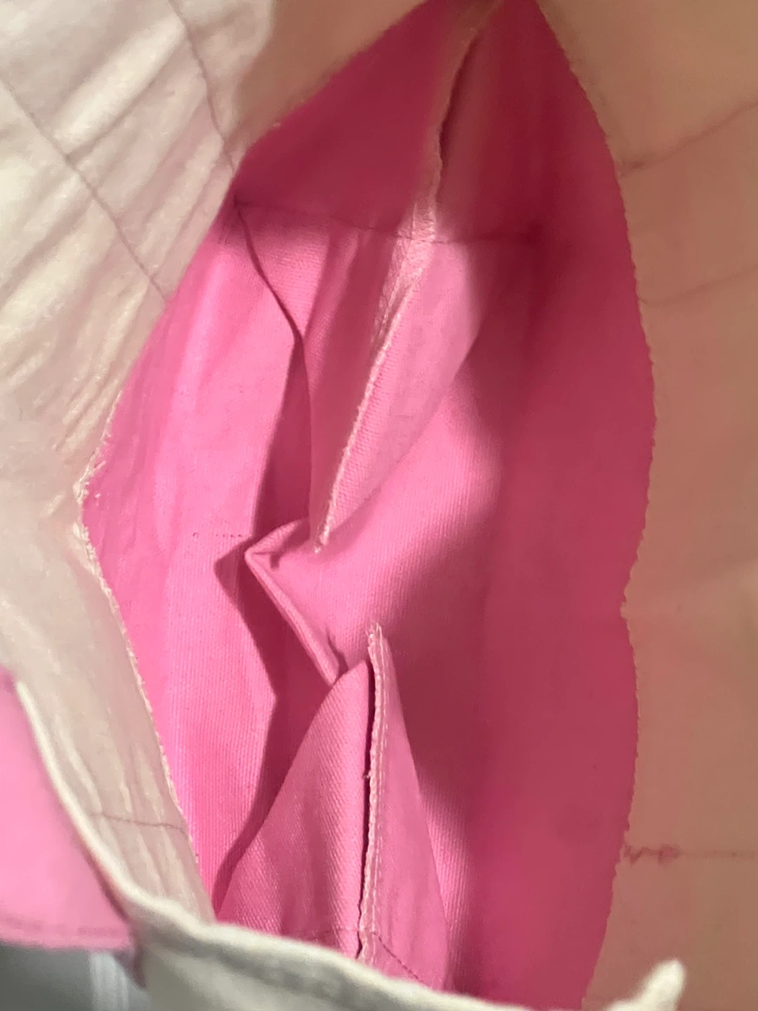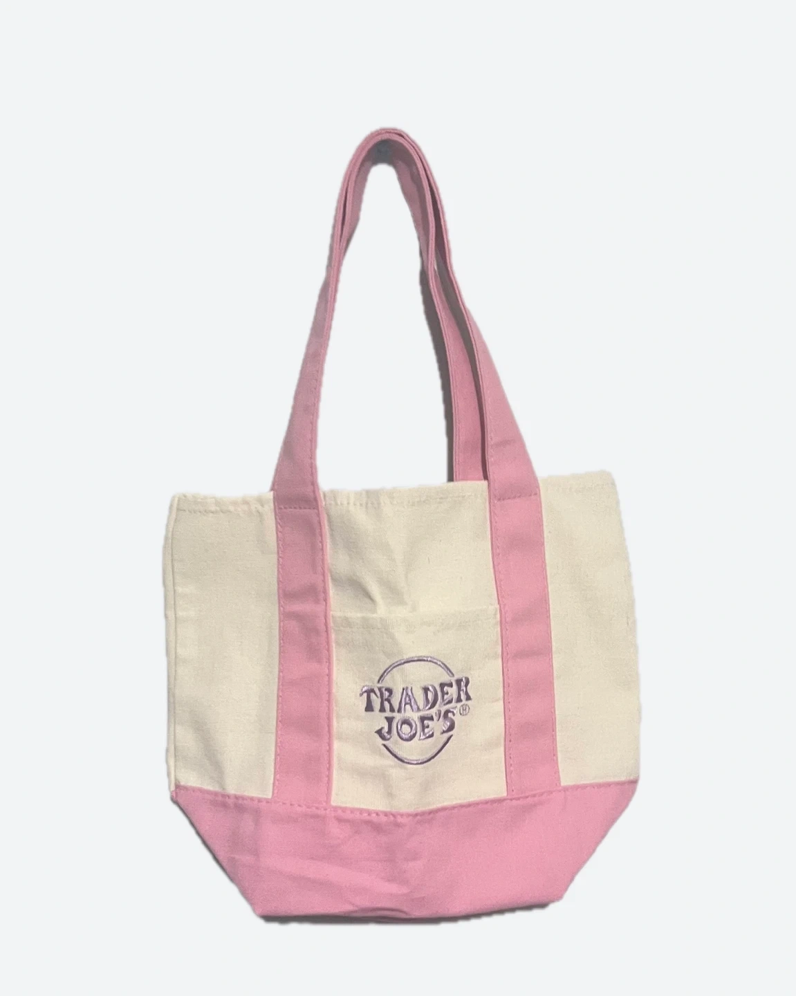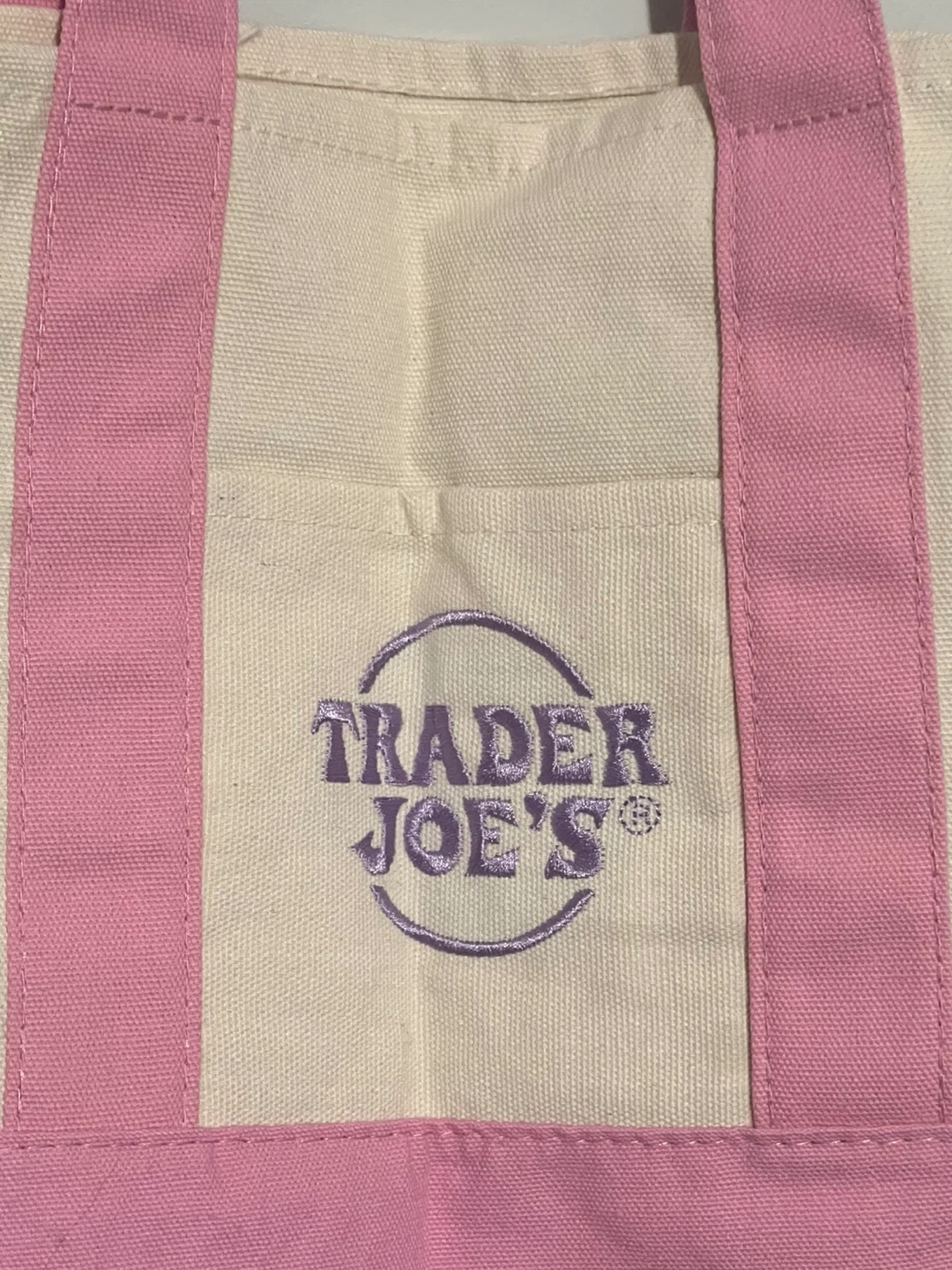 A small canvas tote bag from Trader Joe's. It's cream-coloured with pink handles and trim, and has a front pocket.