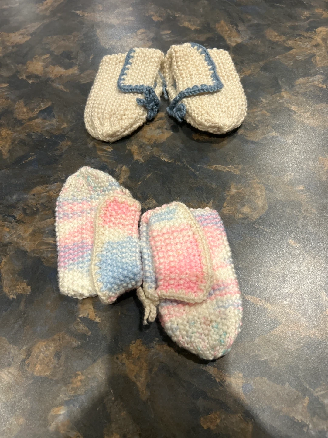 A pair of cream, hand-knit baby booties with blue trim. Also, a pair of pastel pink, blue, and cream striped baby mittens. Both appear to be handmade.