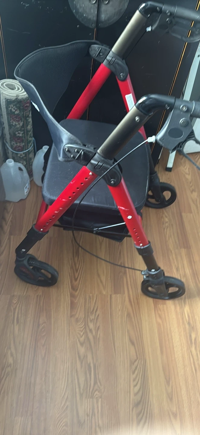This rollator walker has a red frame and a black seat. It features adjustable height handles and brakes. It's designed for mobility assistance.