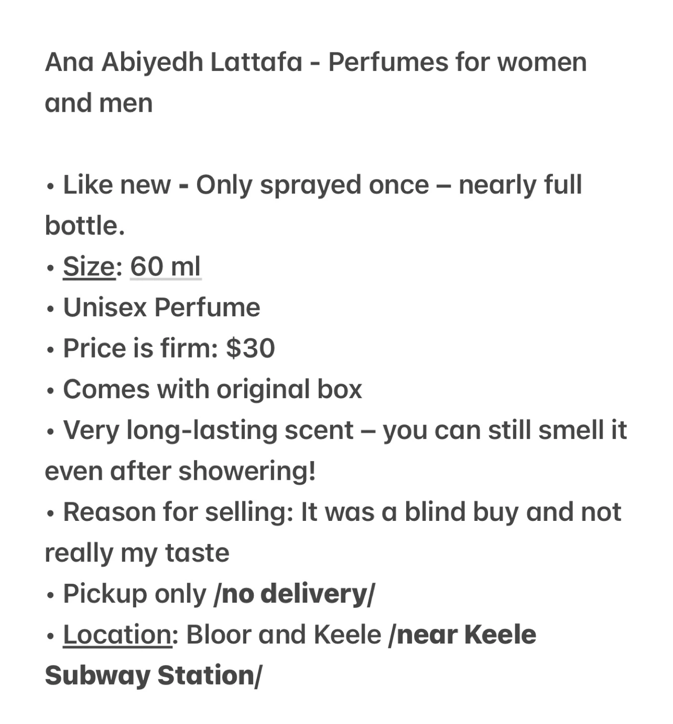 Ana Abiyedh Lattafa - Perfumes for women and men • Like new - Only sprayed once – nearly full bottle. • Size: 60 ml • Unisex Perfume • Price is firm: $30 • Comes with original box • Very long-lasting scent – you can still smell it even after showering! • Reason for selling: It was a blind buy and not really my taste • Pickup only /no delivery/ • Location: Bloor and Keele /near Keele Subway Station/