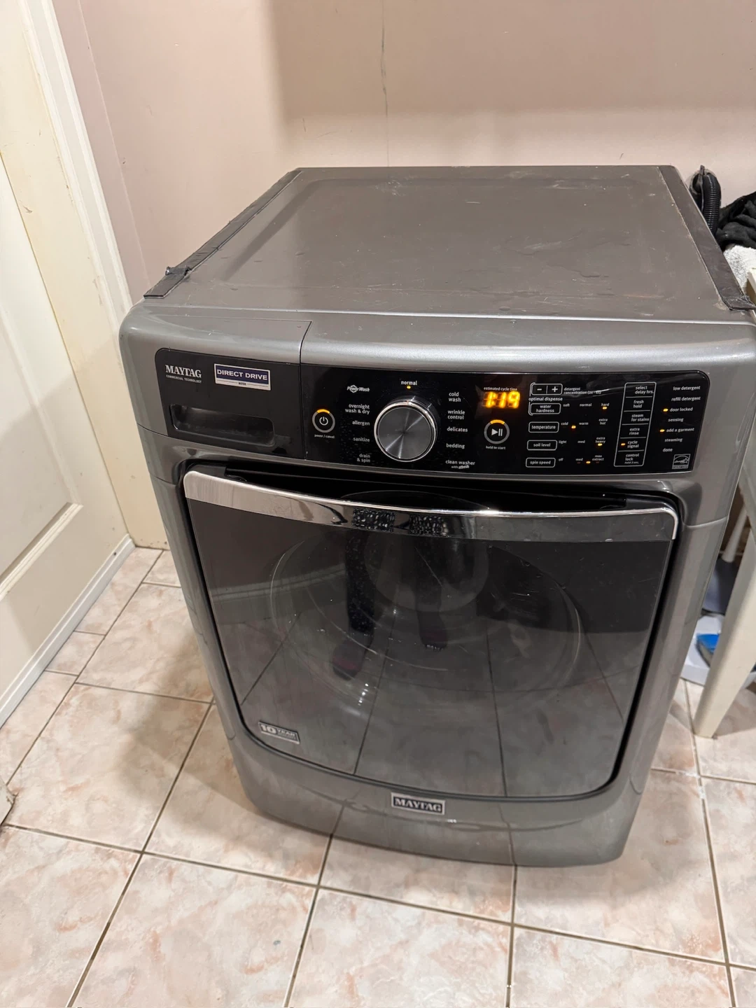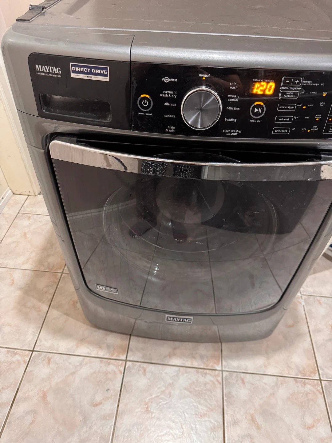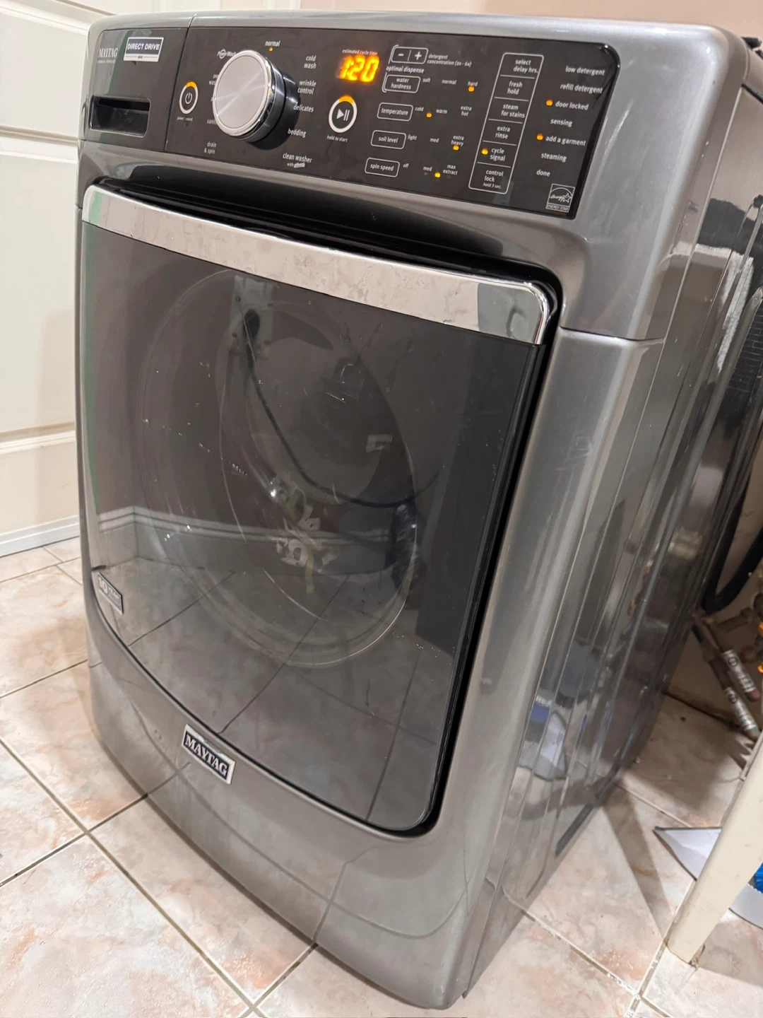 Maytag front load washing machine. Direct Drive motor. AquaWash system. Multiple wash cycles including normal, cold wash, and delicates. Digital display shows cycle time. It's a grey colour.