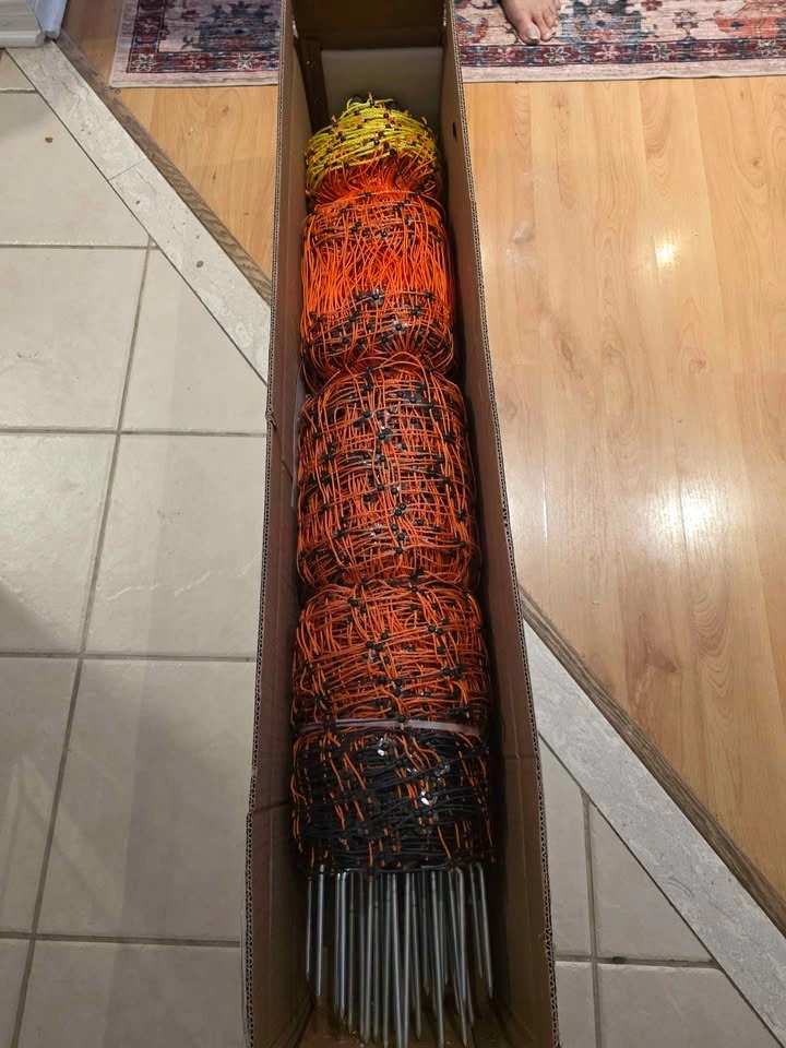 Brand new, never used complete electric net fencing setup with pre-assembled posts. Easy to install and ideal for temporary or movable setups.