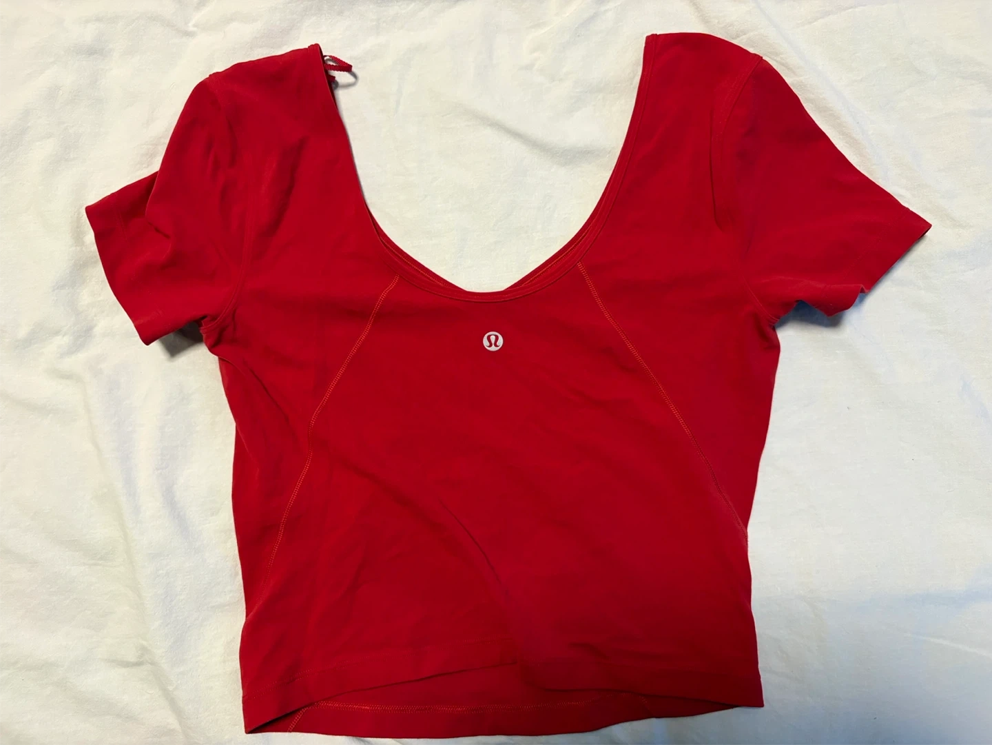 Lululemon cropped short sleeve top in red (Align) It has a V-neck design and short sleeves. Size 6. No visible stains, great condition.