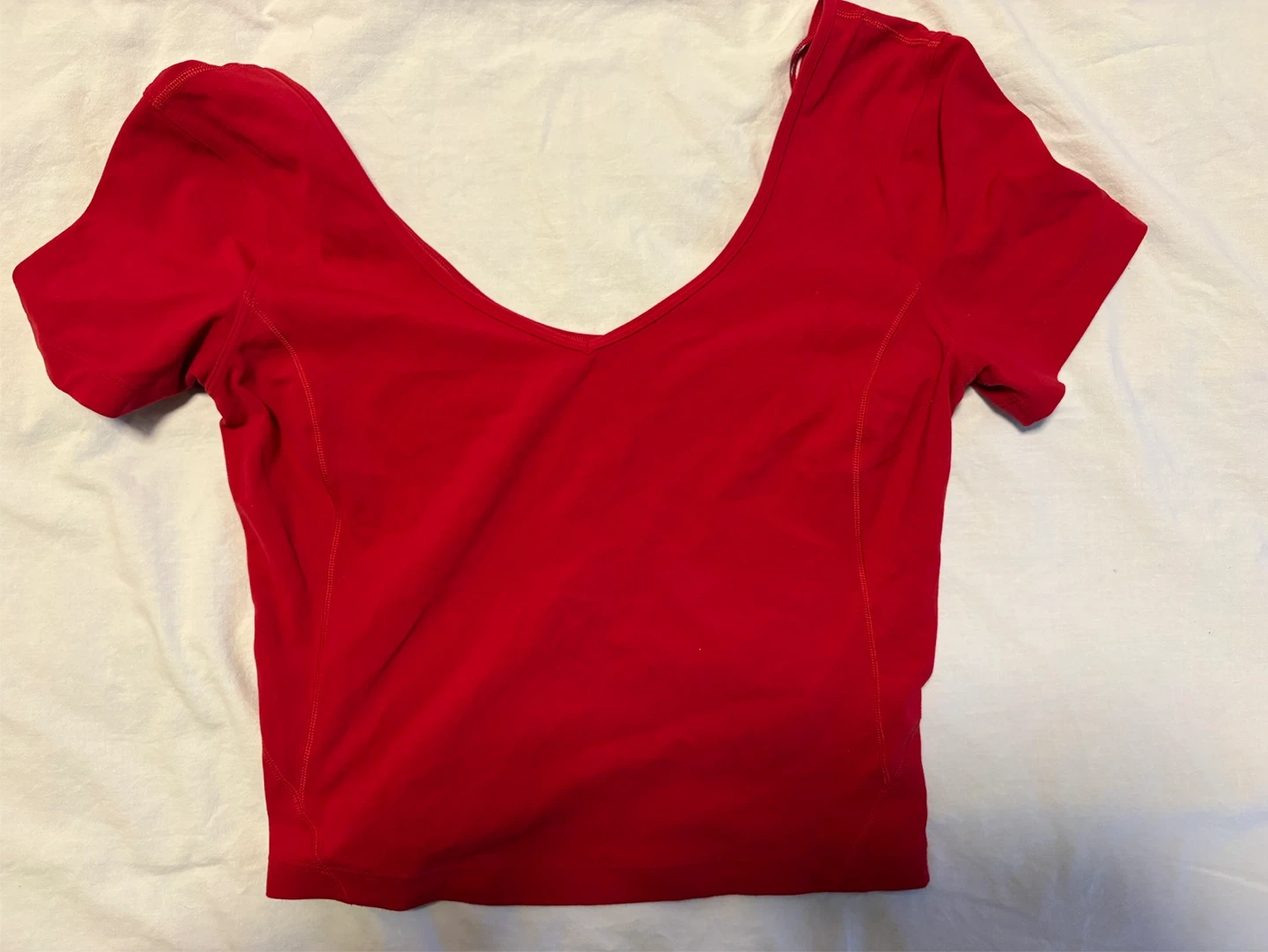 Lululemon cropped short sleeve top in red (Align) It has a V-neck design and short sleeves. Size 6. No visible stains, great condition.