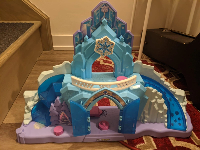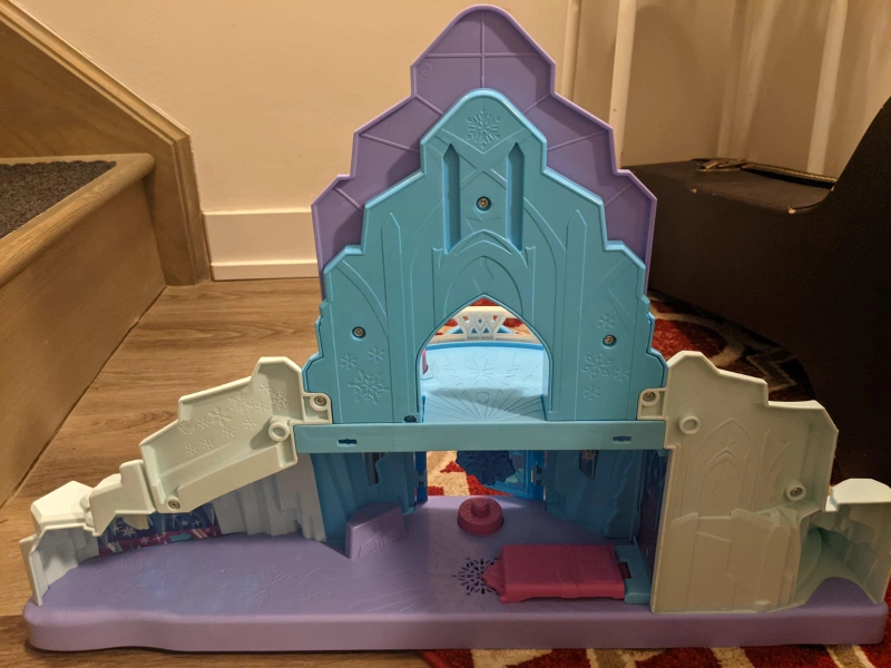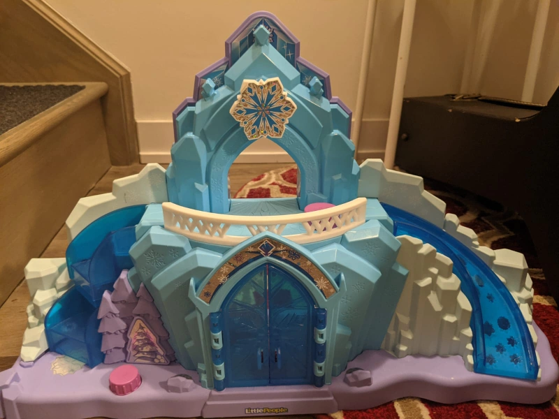 Frozen castle. Features multiple levels, ice slide, and opening doors with music and lights . Suitable for young children. Does not include small accessories!