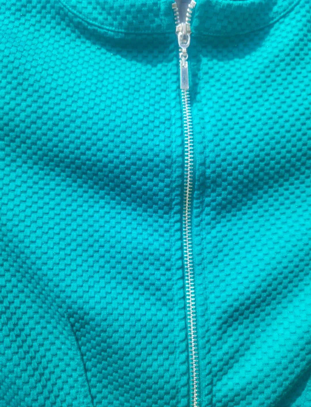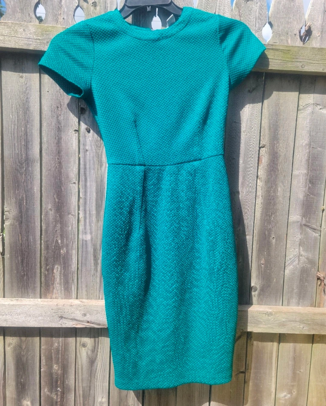 This teal dress features a textured fabric and a convenient zipper down the back. It has short sleeves and a classic fit. It's made of a polyester blend material. H&M