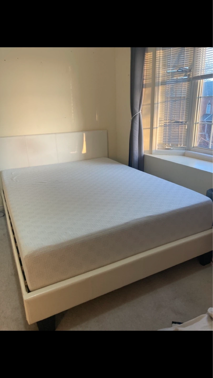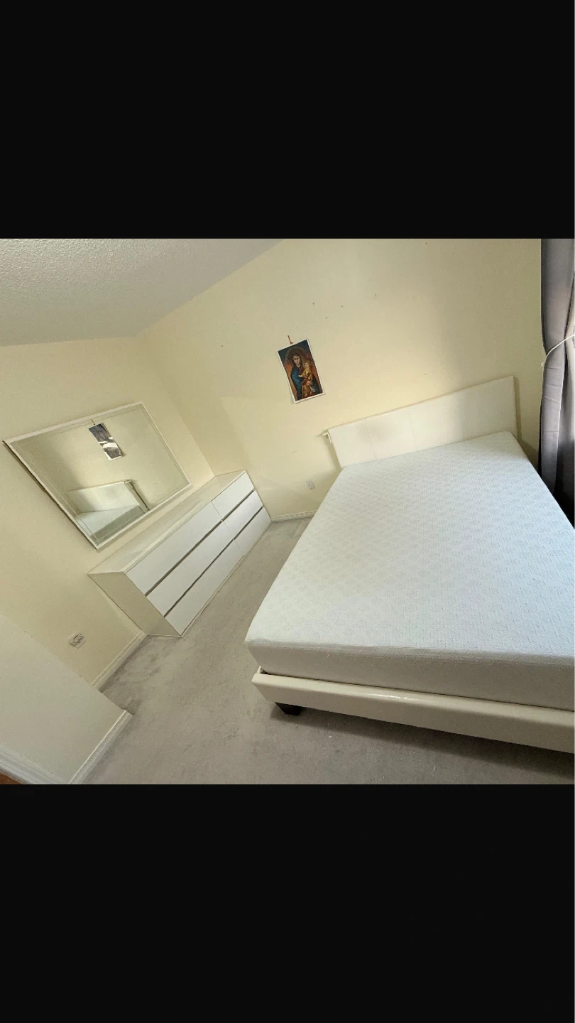 White high-gloss dresser with six drawers. Includes a large rectangular mirror with a white frame. Great for bedroom storage!
