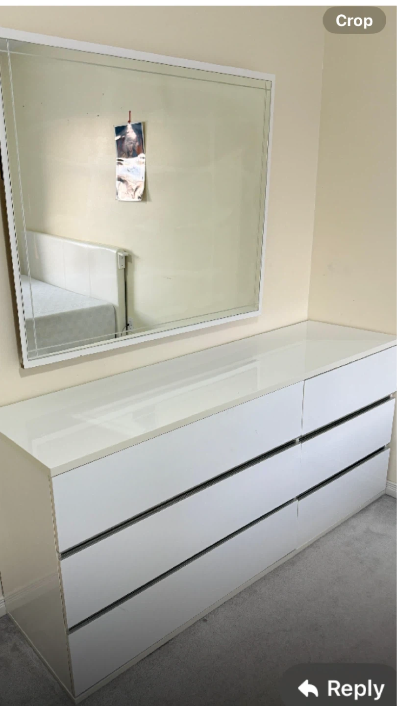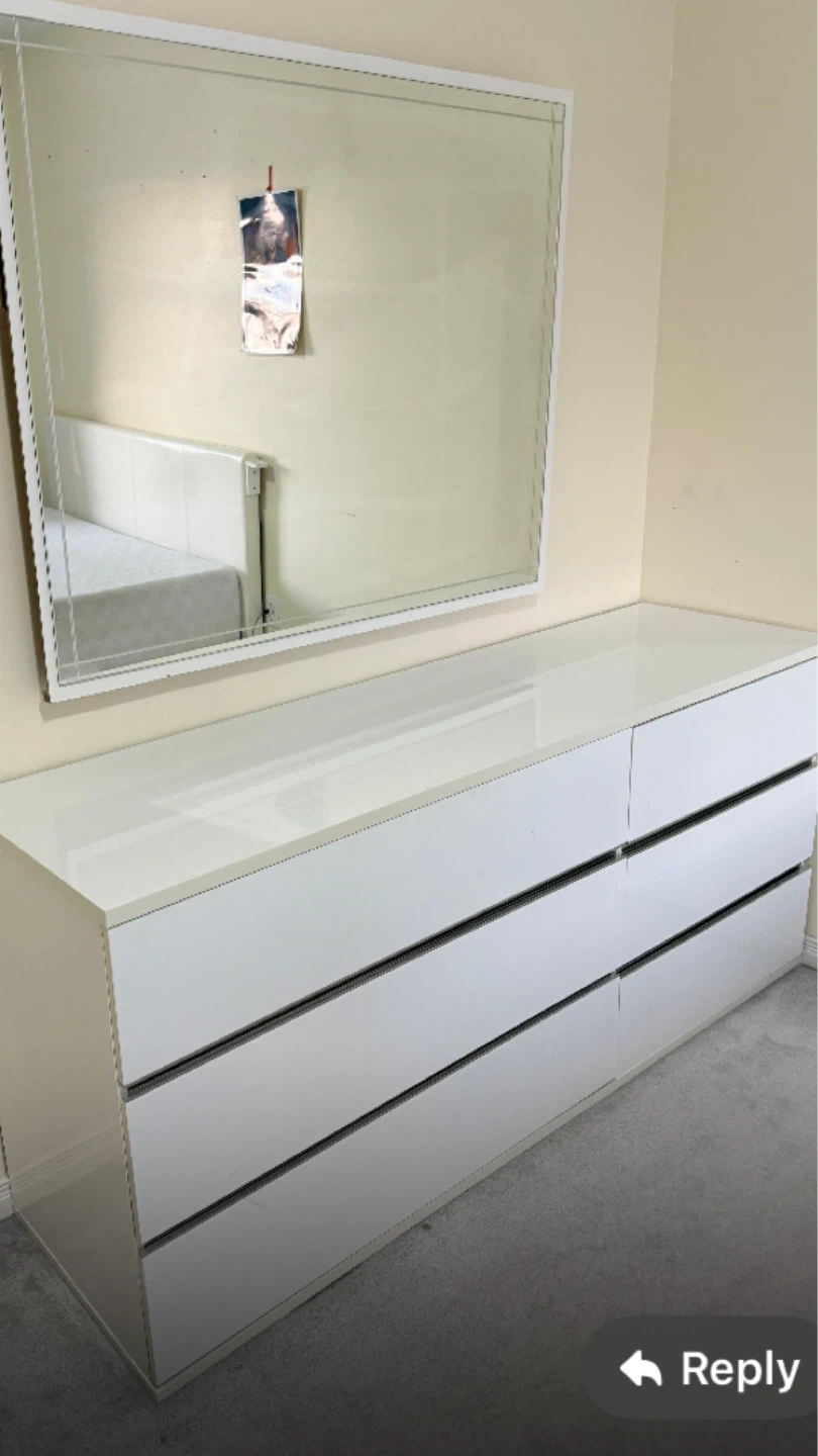 White high-gloss dresser with six drawers. Includes a large rectangular mirror with a white frame. Great for bedroom storage!