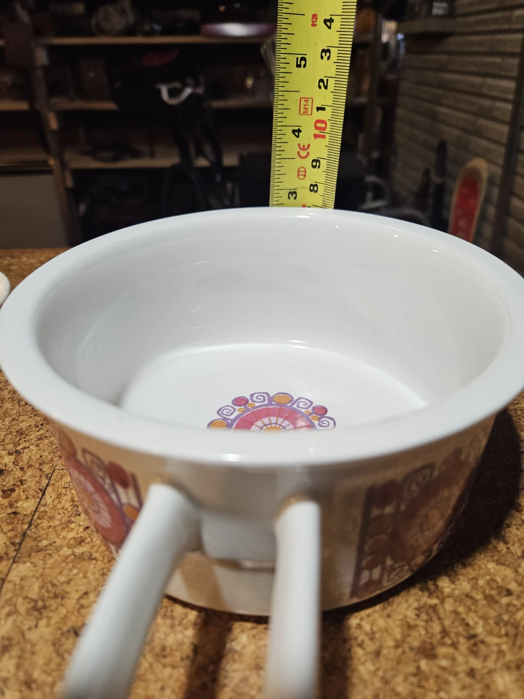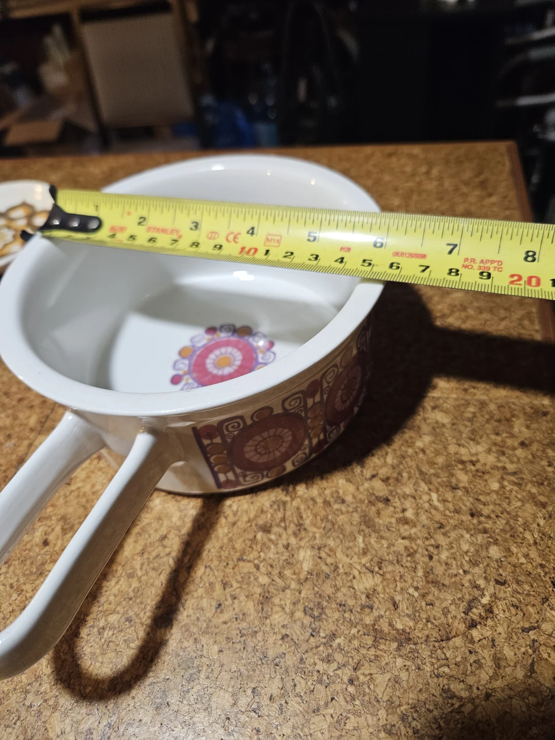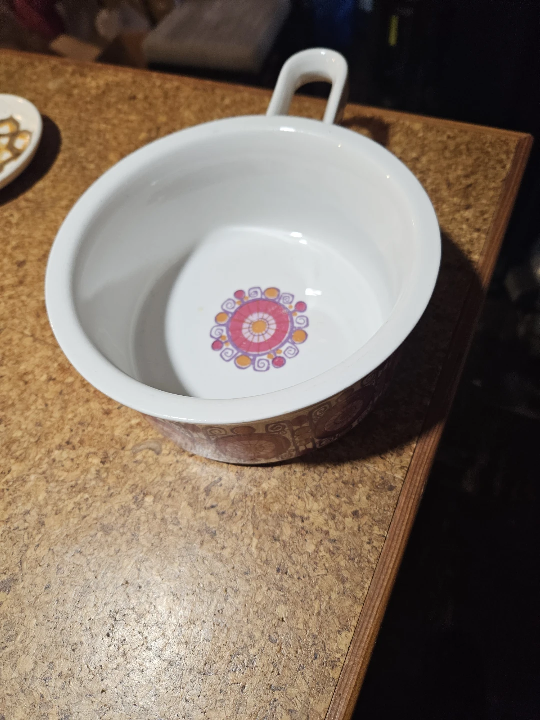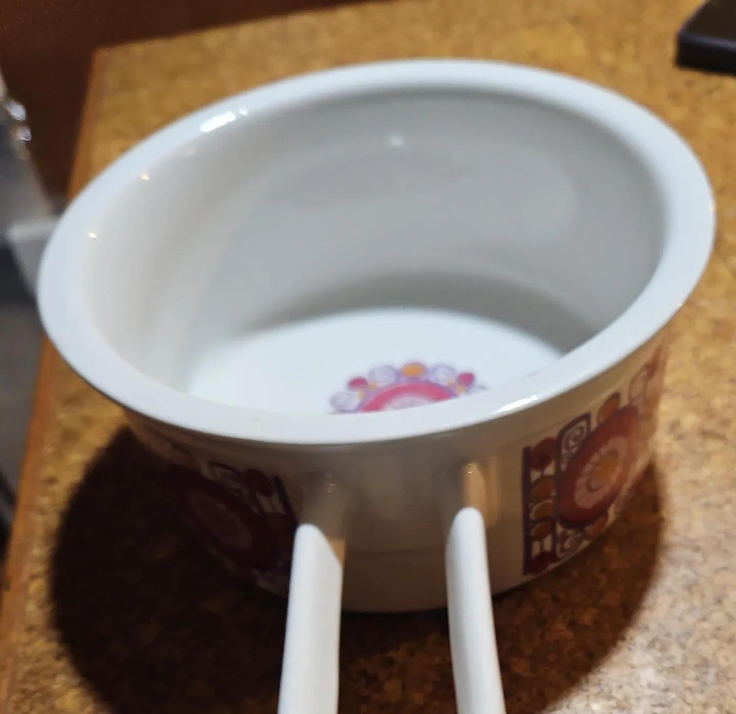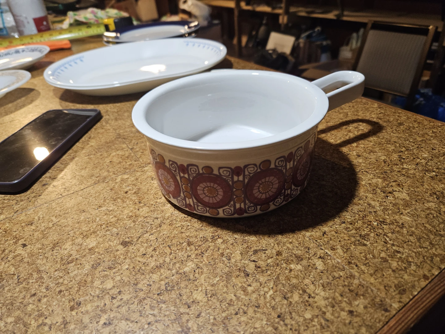 Vintage Figgjo Ljannse serving bowl from Norway. Features a classic retro pattern on the exterior and interior base. Sturdy ceramic material with a comfortable handle.