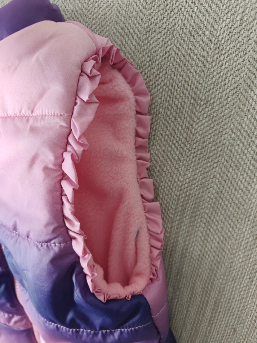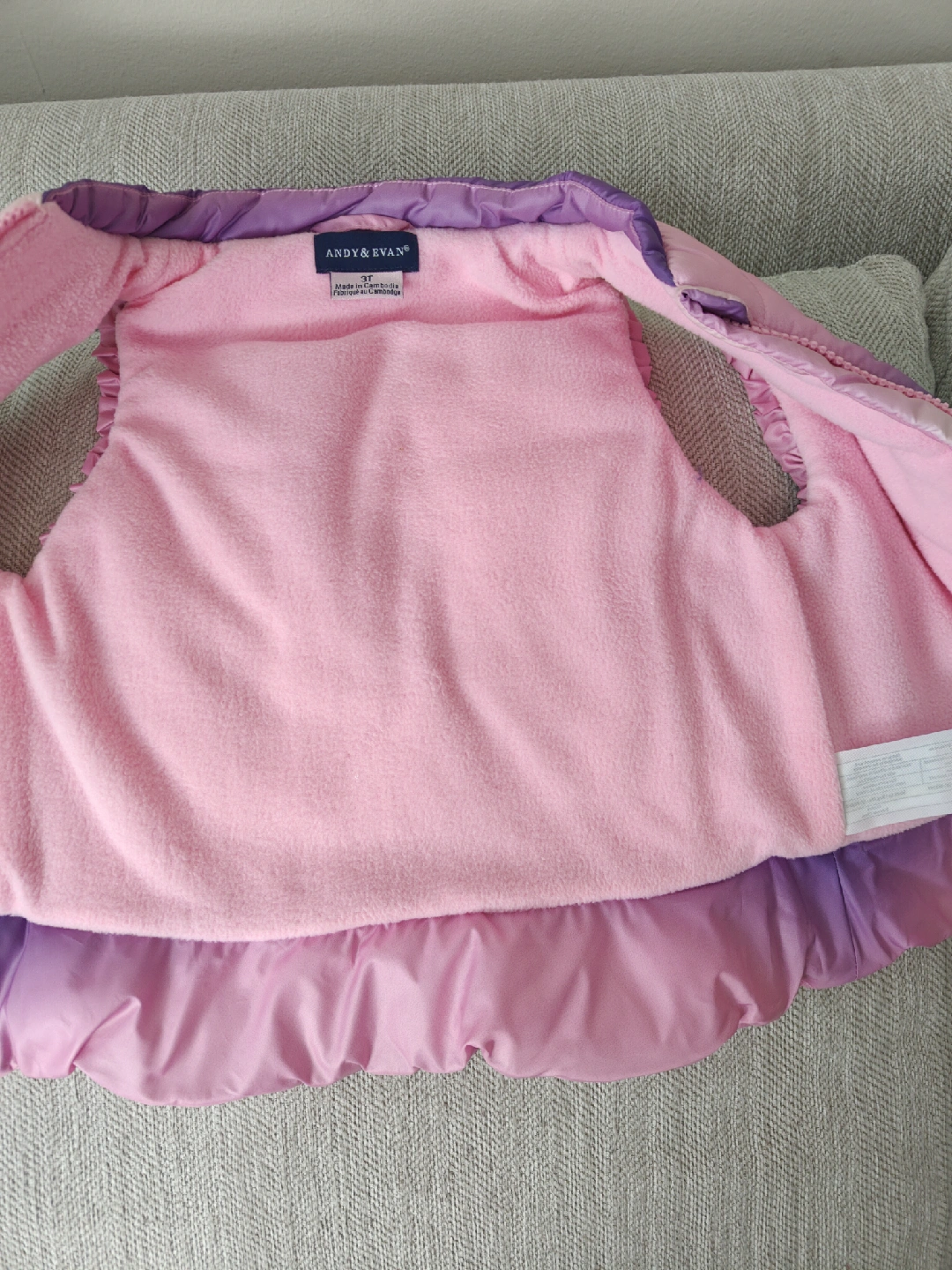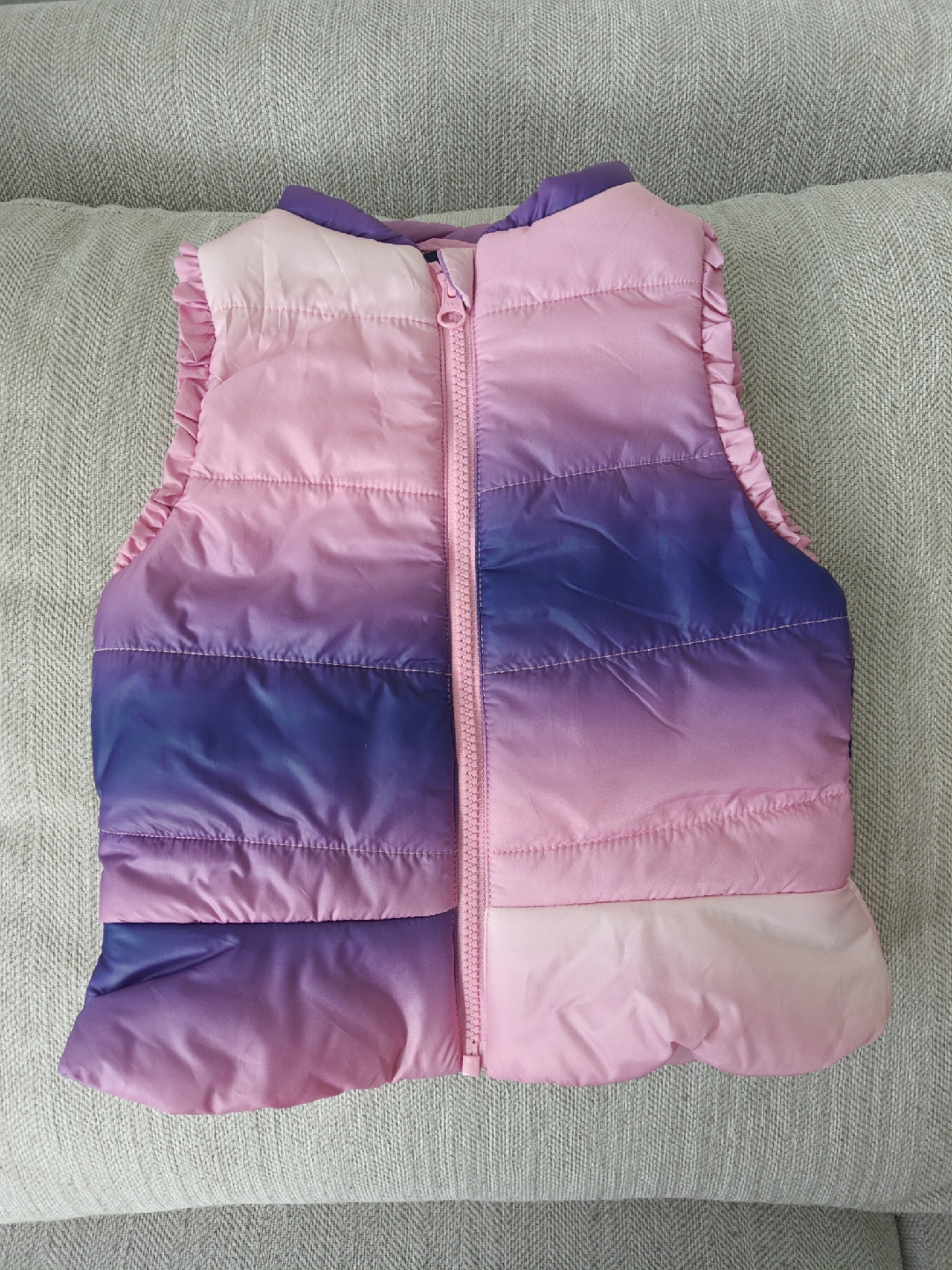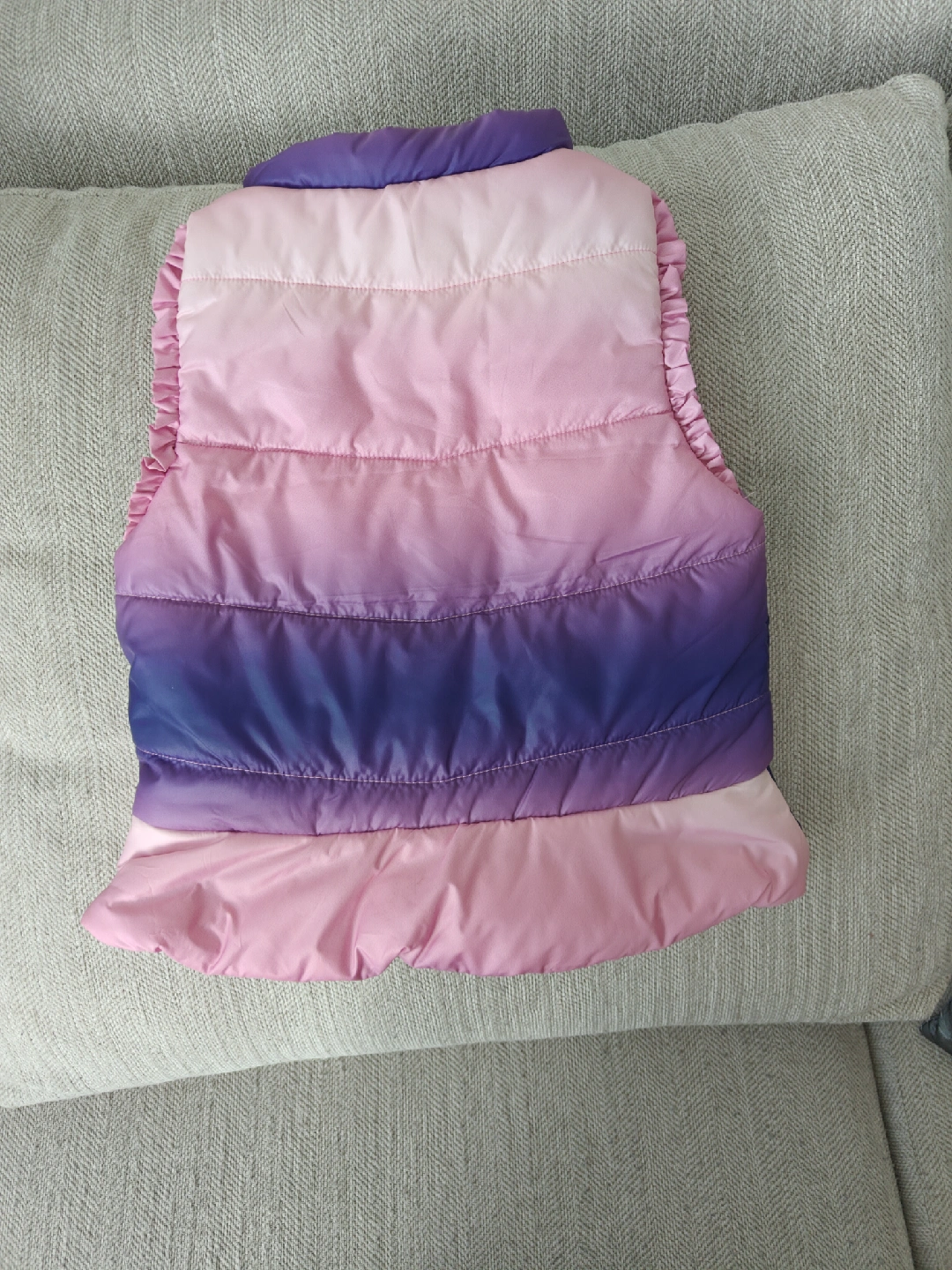 162Here's a gently used Andy & Evan puffer vest in size 3T. It features a lovely gradient from pink to purple, perfect for adding a pop of colour to any outfit! The inside is lined with soft, pink fleece for extra warmth and comfort.