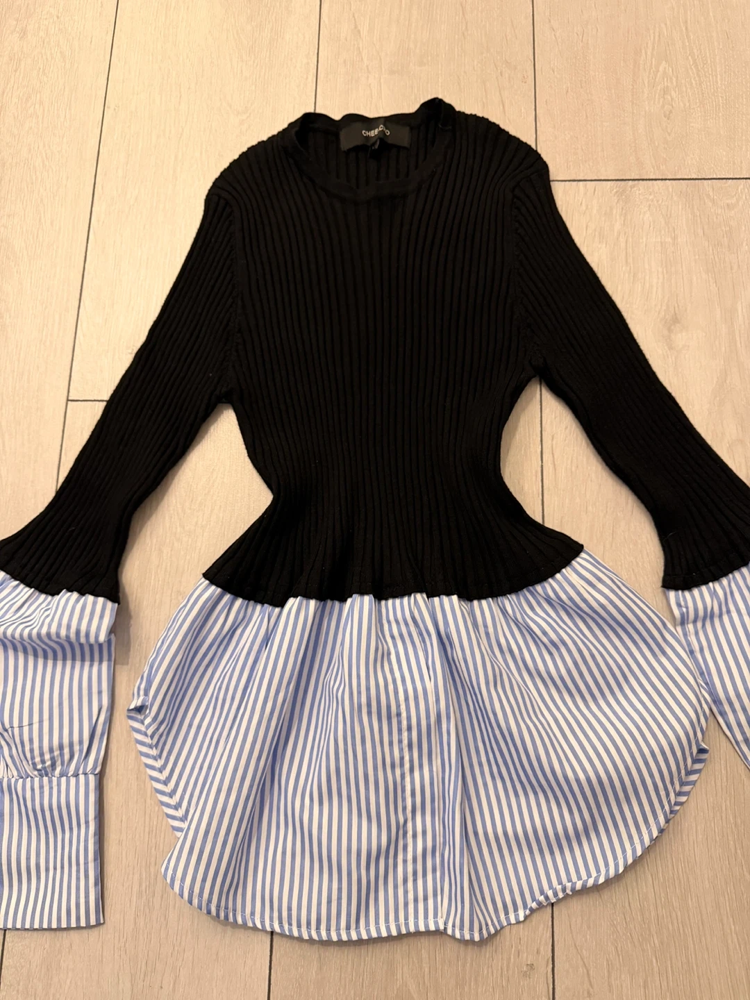 This is a CHE-CHO knit top with a black ribbed bodice and contrasting blue and white striped bottom. It's a size large. The sleeves have button cuffs.