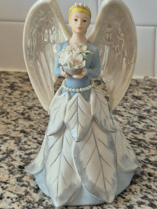 A beautiful angel figurine holding a bouquet of flowers. The angel is wearing a light blue dress with a pearl necklace and a white gown made of leaves. The wings are pearlescent white. It would make a lovely addition to any home!
