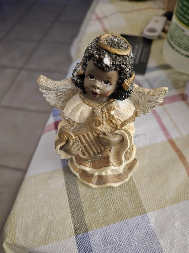 698A lovely angel figurine playing a harp. It's in good condition and would make a sweet addition to any collection or as a decorative piece in your home