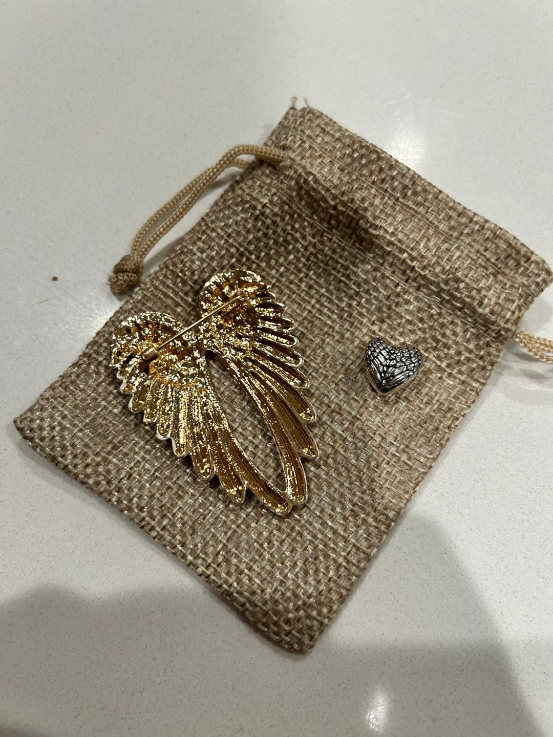 89Selling a lovely angel wings brooch with a heart charm. It comes with a small burlap bag, perfect for gifting or storage. The brooch features intricate detailing and a beautiful design. pick up one minute from King George skytrain station (Surrey bc) Or can mail for free ***charm fits Pandora bracelet Comes in burlap dust bag Please respect pricing God bless!