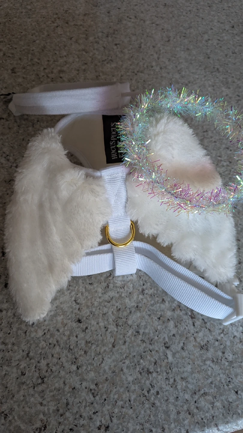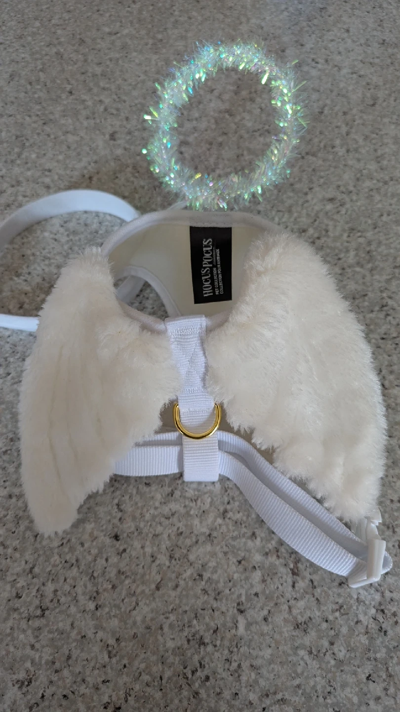 60size M angel wings dog harness! It's a super cute accessory for your furry friend. The harness is white and features fluffy angel wings and a sparkly halo. Perfect for hallowen or just adding a touch of whimsy to your dog's wardrobe