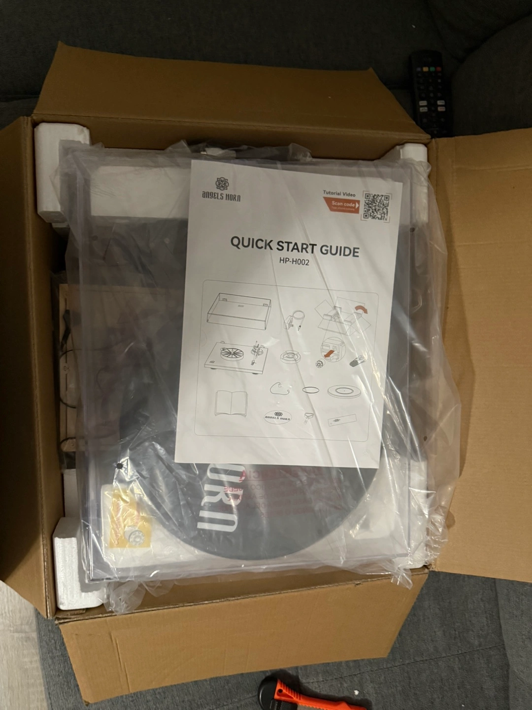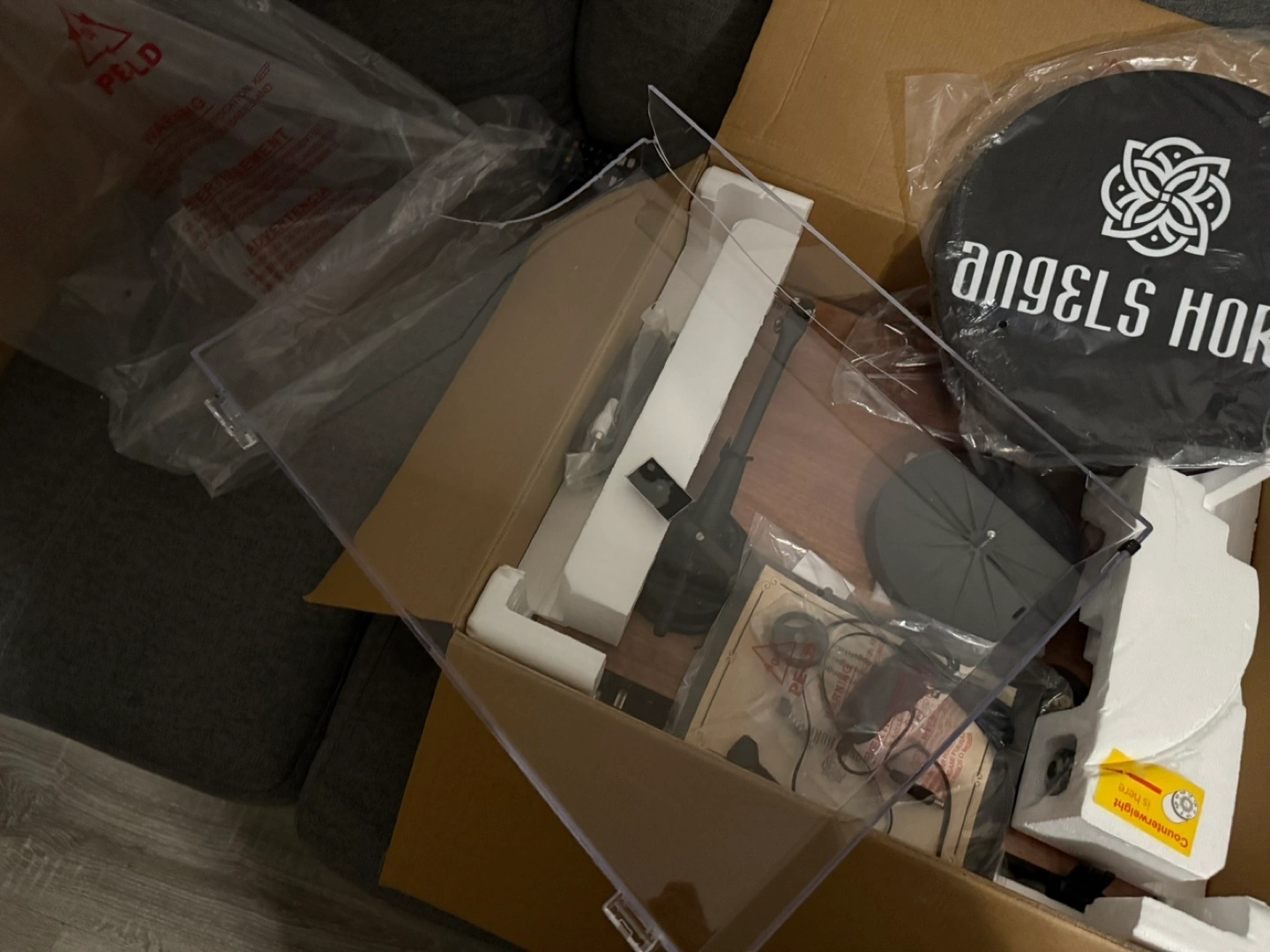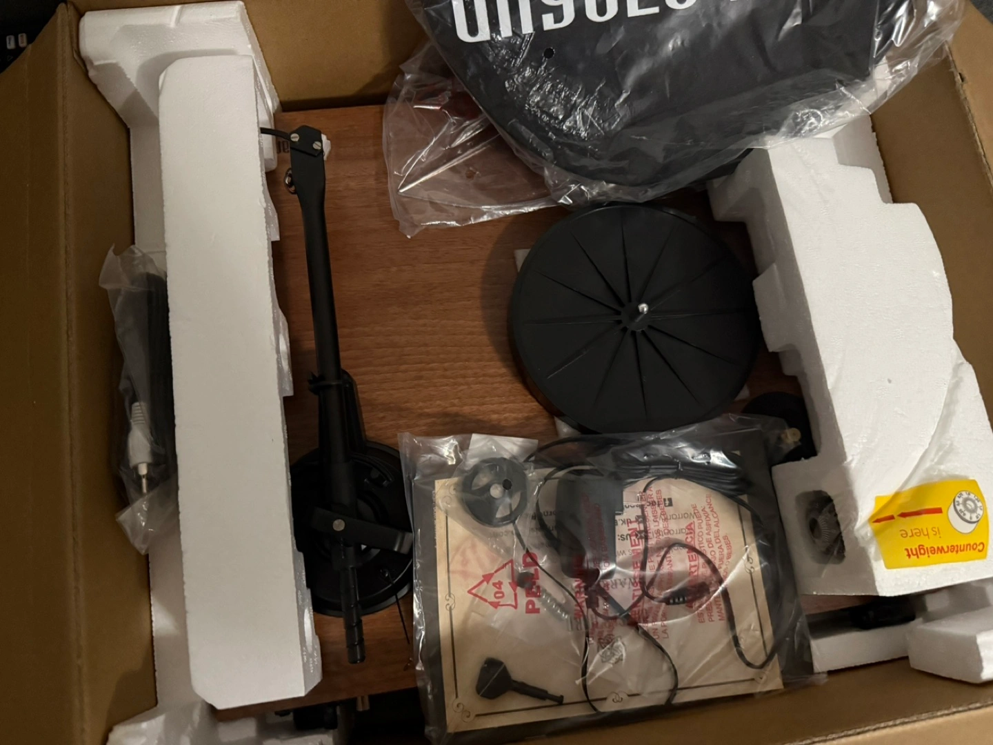 A brand new turntable set up in its original packaging. Accessories like a platter and counterweight included. Selling cause drop the lid and broke when unpacking.