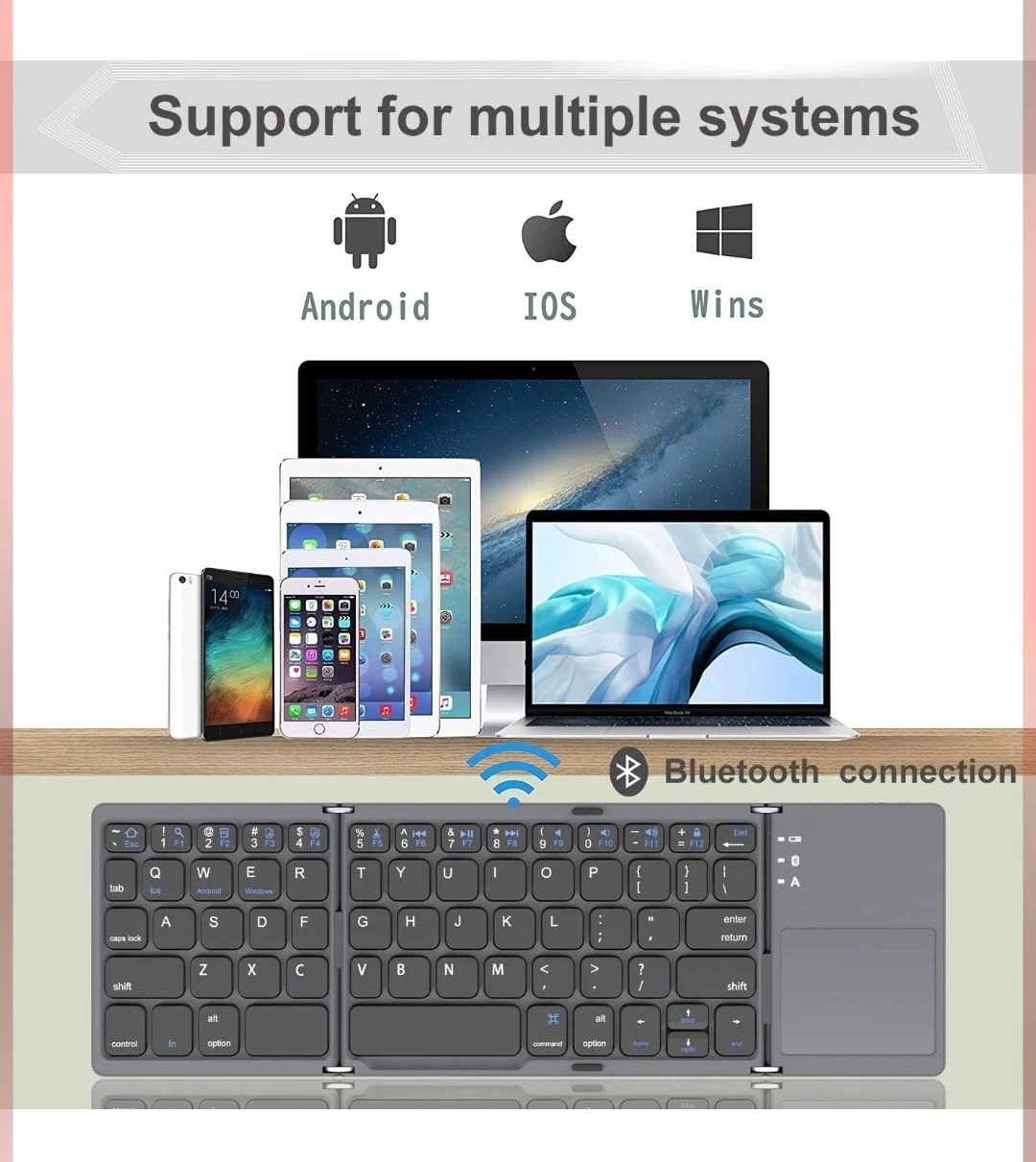 This foldable Bluetooth keyboard is designed for portability and ease of use. It features a full QWERTY layout with a built-in touchpad for convenient navigation. This keyboard supports multiple systems, including Android, iOS, and Windows. It's perfect for typing on the go!