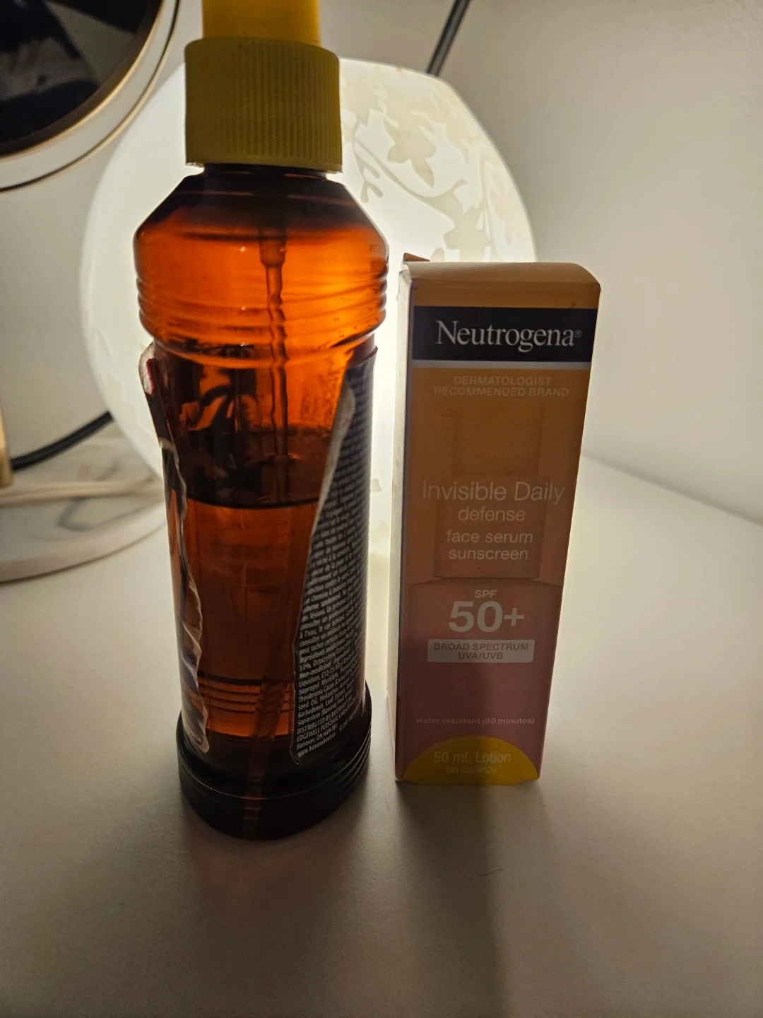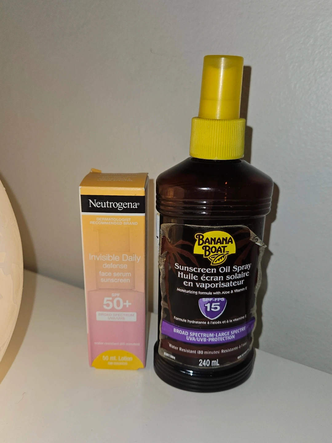 Neutrogena Invisible Daily Defense face serum with SPF 50+. Banana Boat Sunscreen Oil Spray with SPF 15. Both are 50 mL and 240 mL respectively. Water resistant up to 80 minutes.