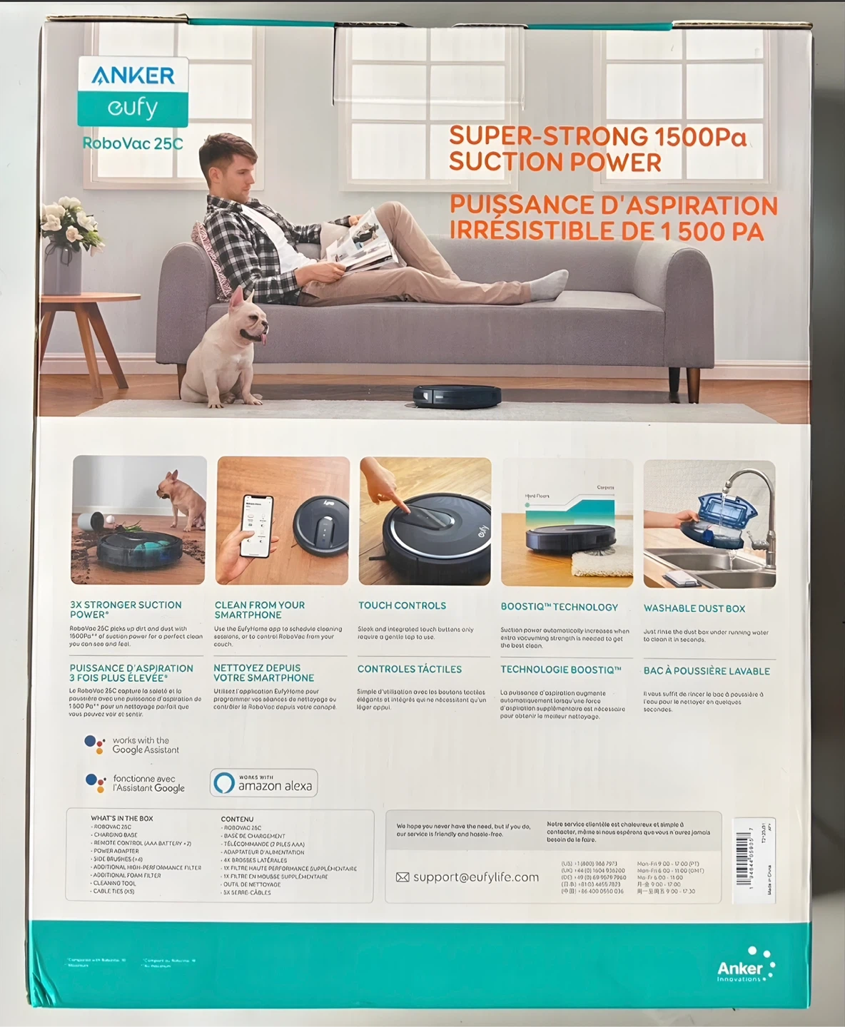 212Selling a brand new Eufy RoboVac 25C by Anker! It's still in its original packaging and ready to go to a new home. This robo vac features 3X stronger suction power and is Wi-Fi enabled so you can control it with your smartphone. It also works with Google Assistant and Amazon Alexa. The slim design allows it to glide under furniture easily.