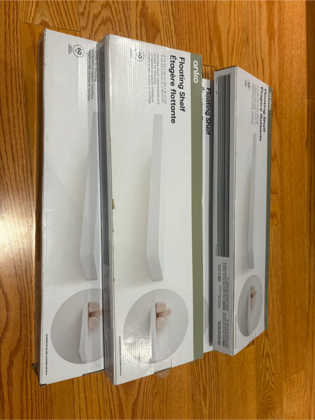 143I have 4 floating shelves brand new never assembled, looking to sell them preferably all together but if not each is 10$ each!