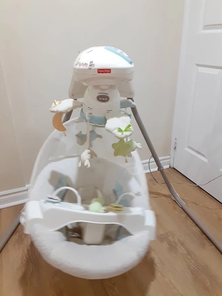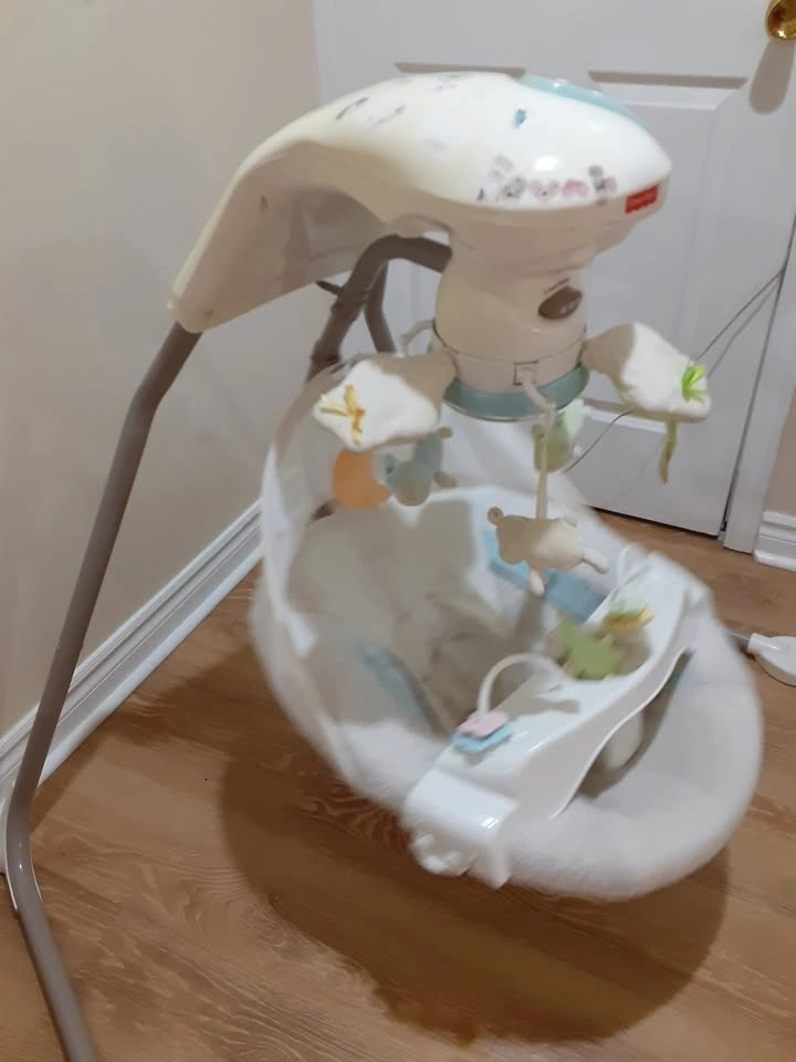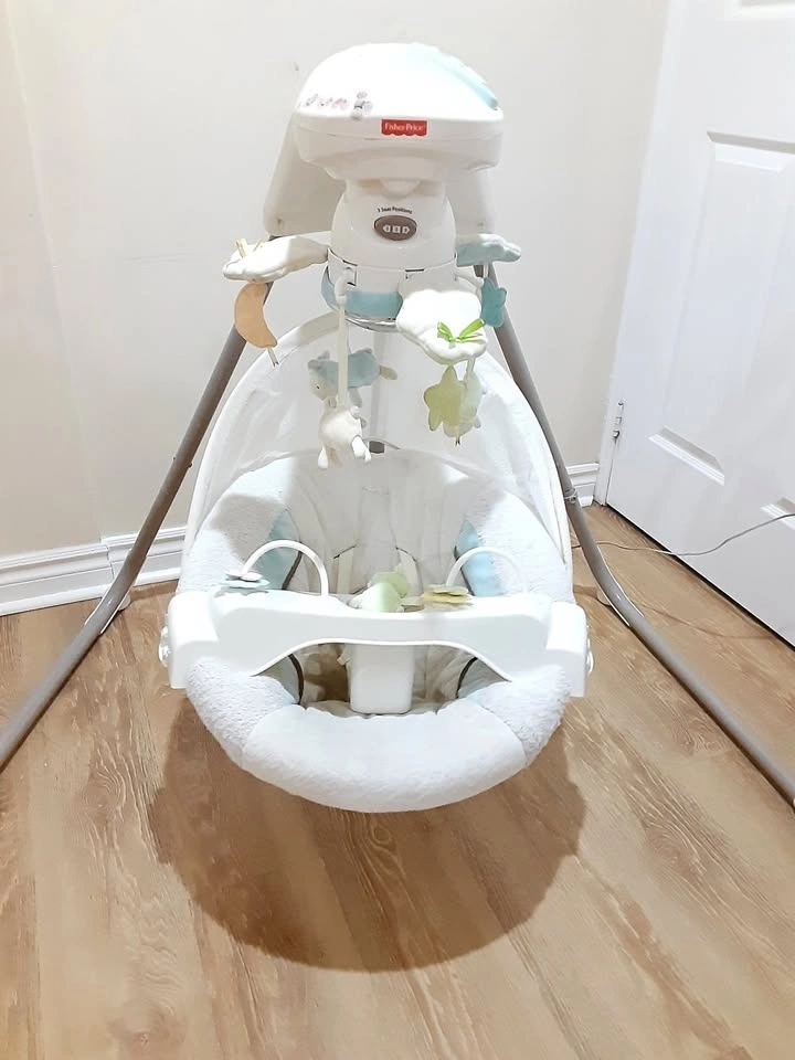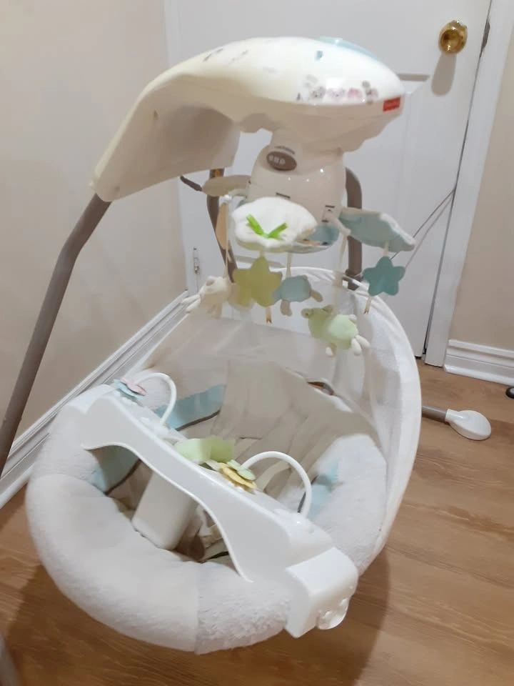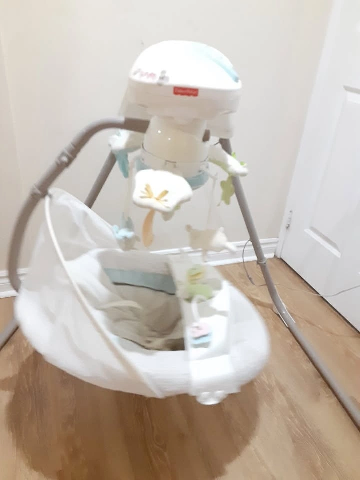 Compact baby swing designed to save space, ideal for any room. Carry handle for easy moving. Folds for storage. Adjustable speeds. Overhead toy bar with 2 soft toys. Infant head support (removable). 5-point harness. Battery operated. Washable fabric, cleaned and sanitized. Pet free, smoke free, bug free, and stain free. Pickup only. DM for prices.