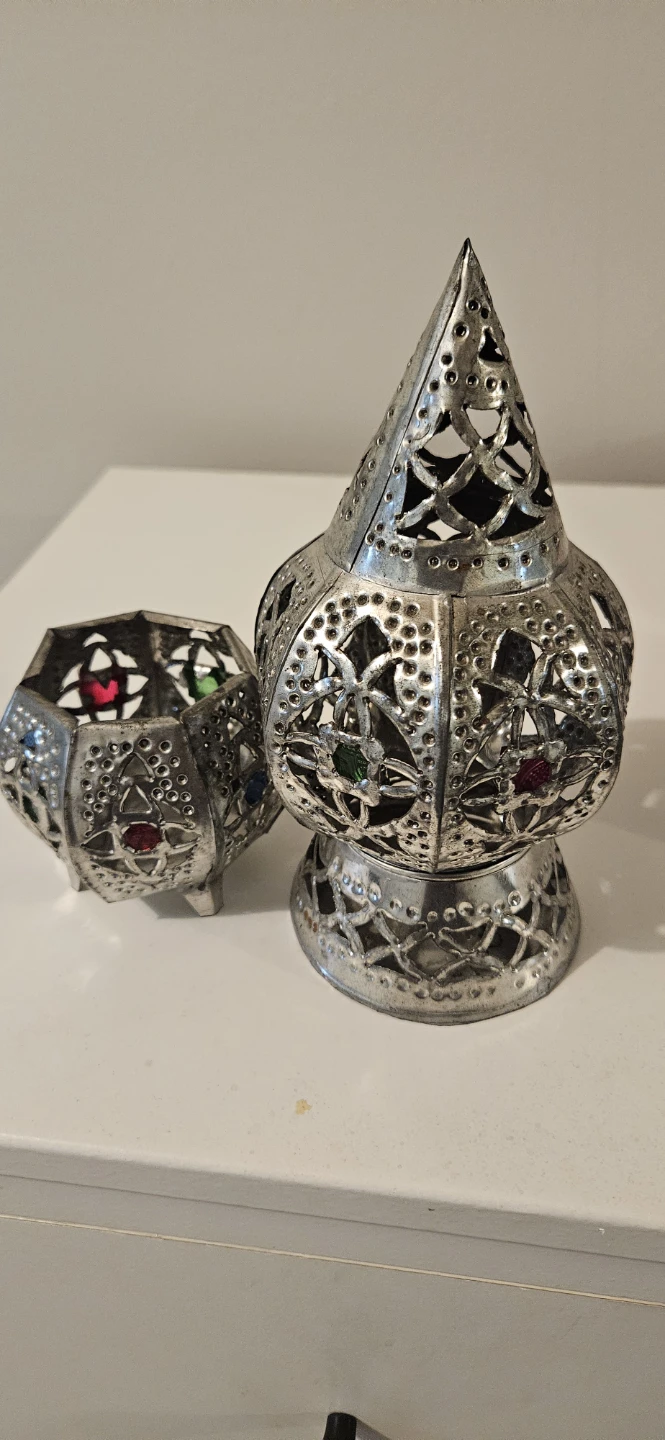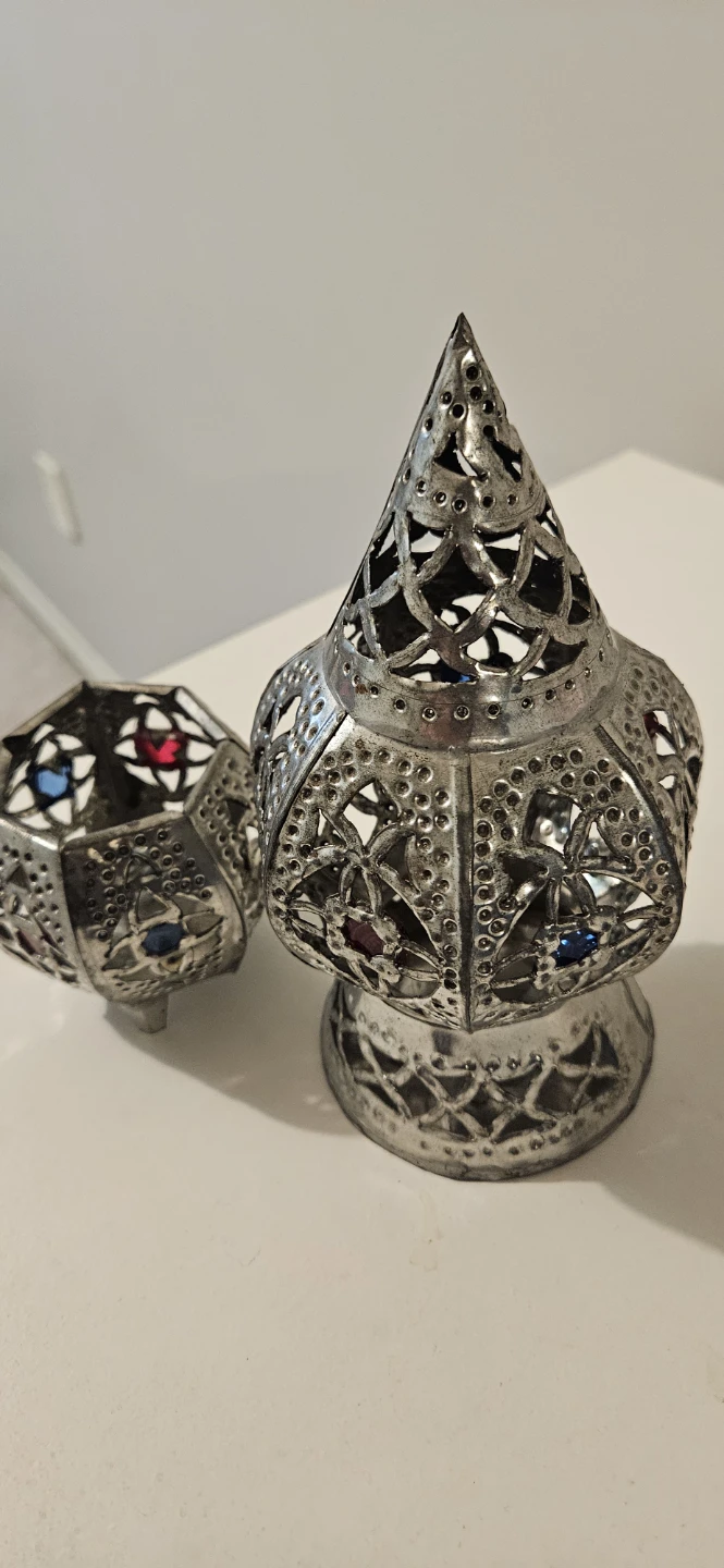 🥕A set of two decorative metal lanterns to burn tea candles with intricate cut-out designs. These lanterns feature colourful glass jewels that cast a beautiful colourful glow. They're made of metal and have a silver-tone finish. Perfect for adding a touch of ambiance to any room!