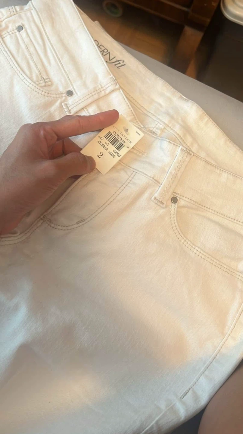 These are a pair of Ann Taylor Modern Fit pants in size 2. They are a cream or off-white colour and appear to be in excellent condition! Perfect for a clean, classic look 📍Don Mills/Sheppard-Yonge