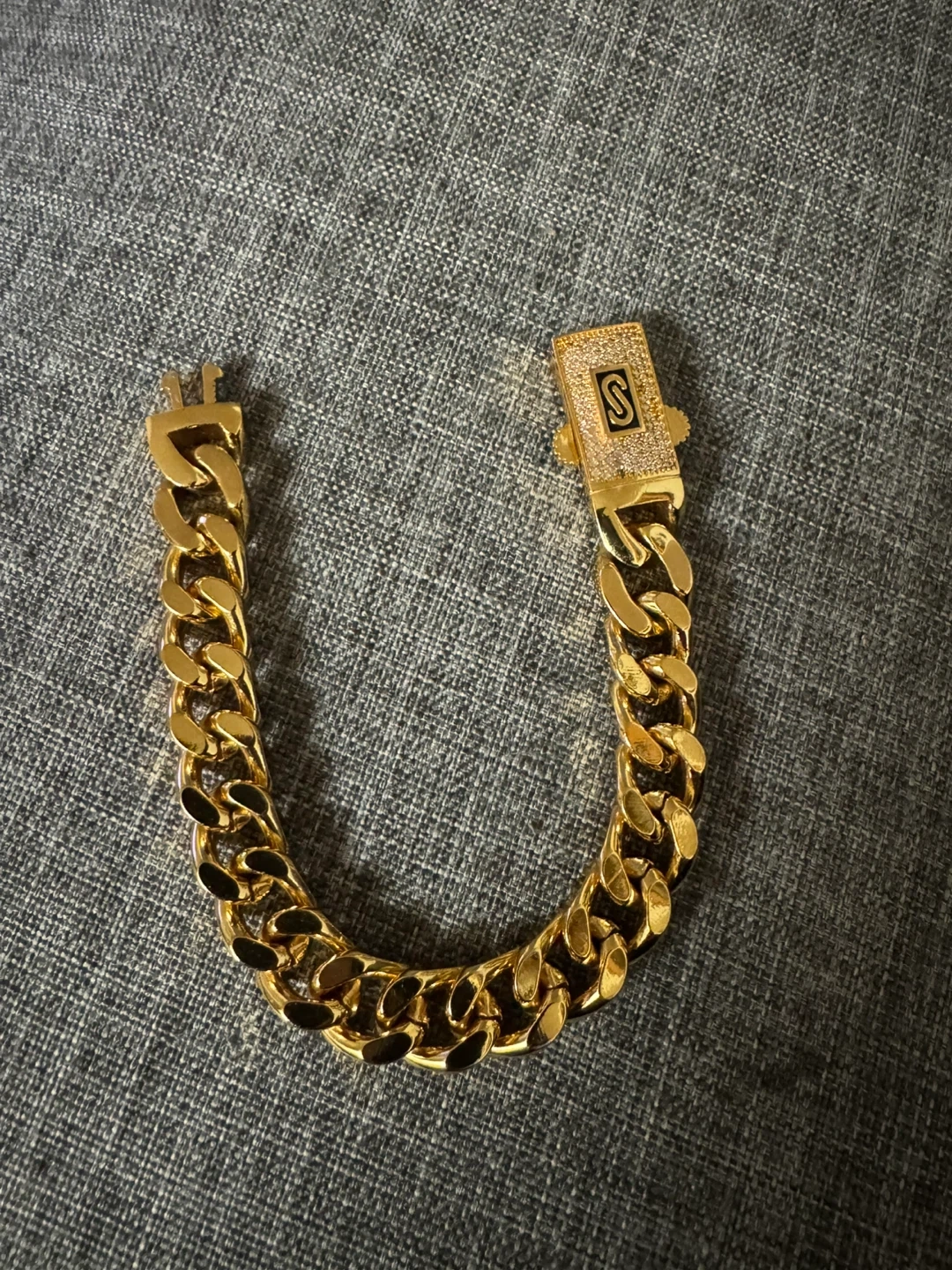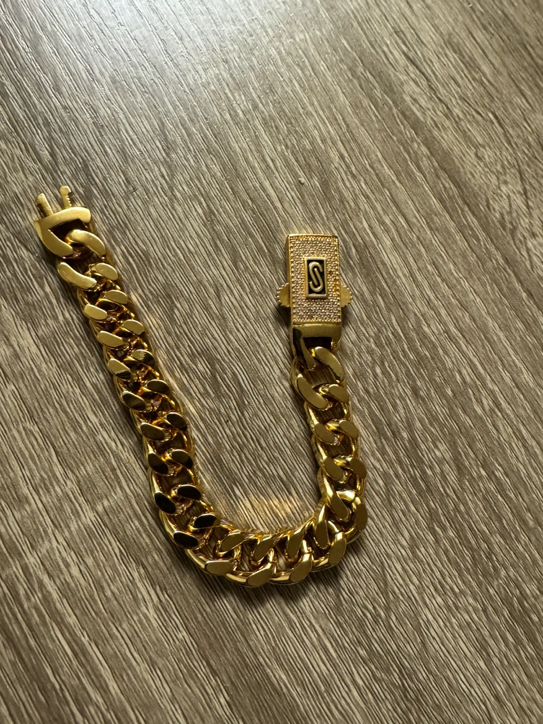 Selling a gold Cuban link bracelet. It features an 'S' clasp, adding a unique touch to this stylish piece. The bracelet is in great condition and ready to wear!