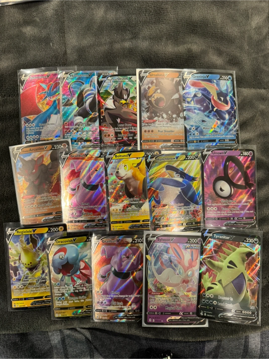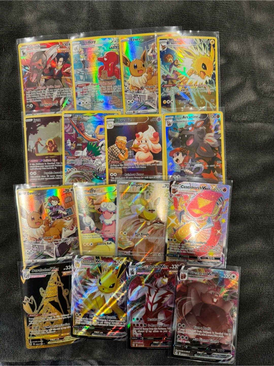 Collection of various Pokémon trading cards. Includes V, VMAX, and GX cards. These cards are perfect for collectors and players alike. All cards are in protective sleeves.