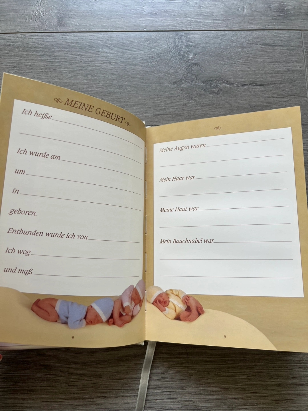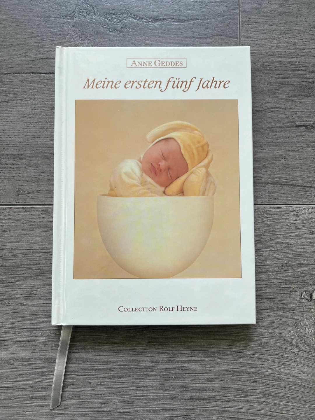 “Meine ersten fünf Jahre" by Anne Geddes. German language. It's a beautiful keepsake book to record memories from your baby's first five years. Perfect for new parents or as a thoughtful baby shower gift