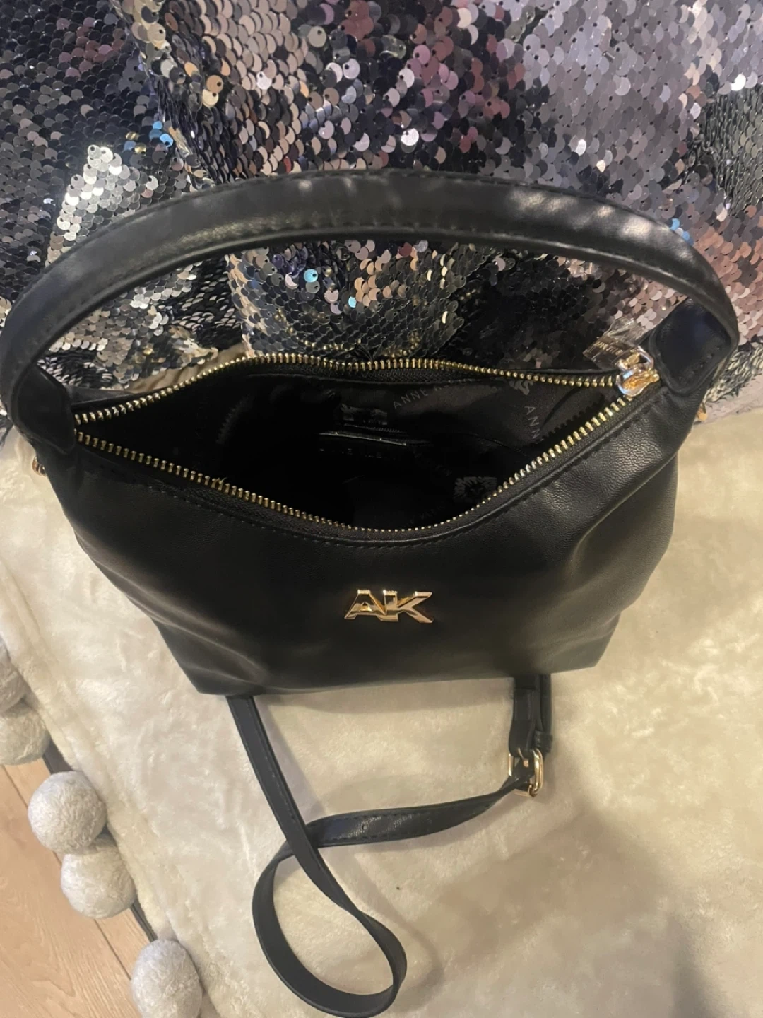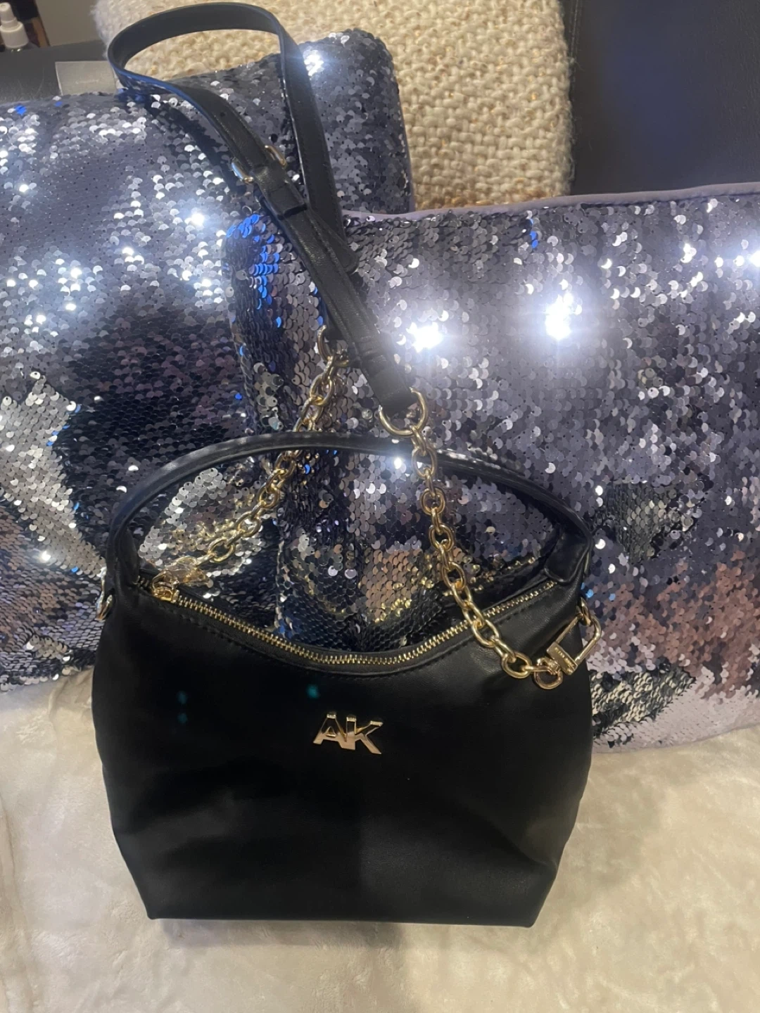 232Here's a cute black handbag from Anne Klein! It's brand new and has a gold chain detail. Perfect for a night out or just running errands around town