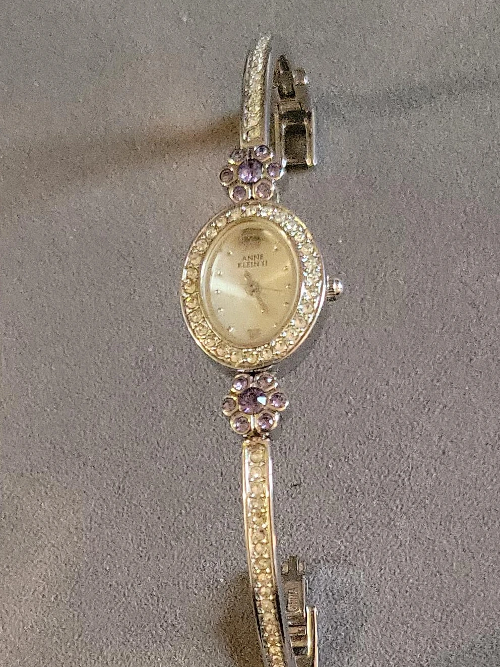 77Selling a lovely Anne Klein II watch! It features a silver tone band and watch face, accented with sparkly details and pretty purple stones. A stylish addition to any outfit! Needs a new battery.