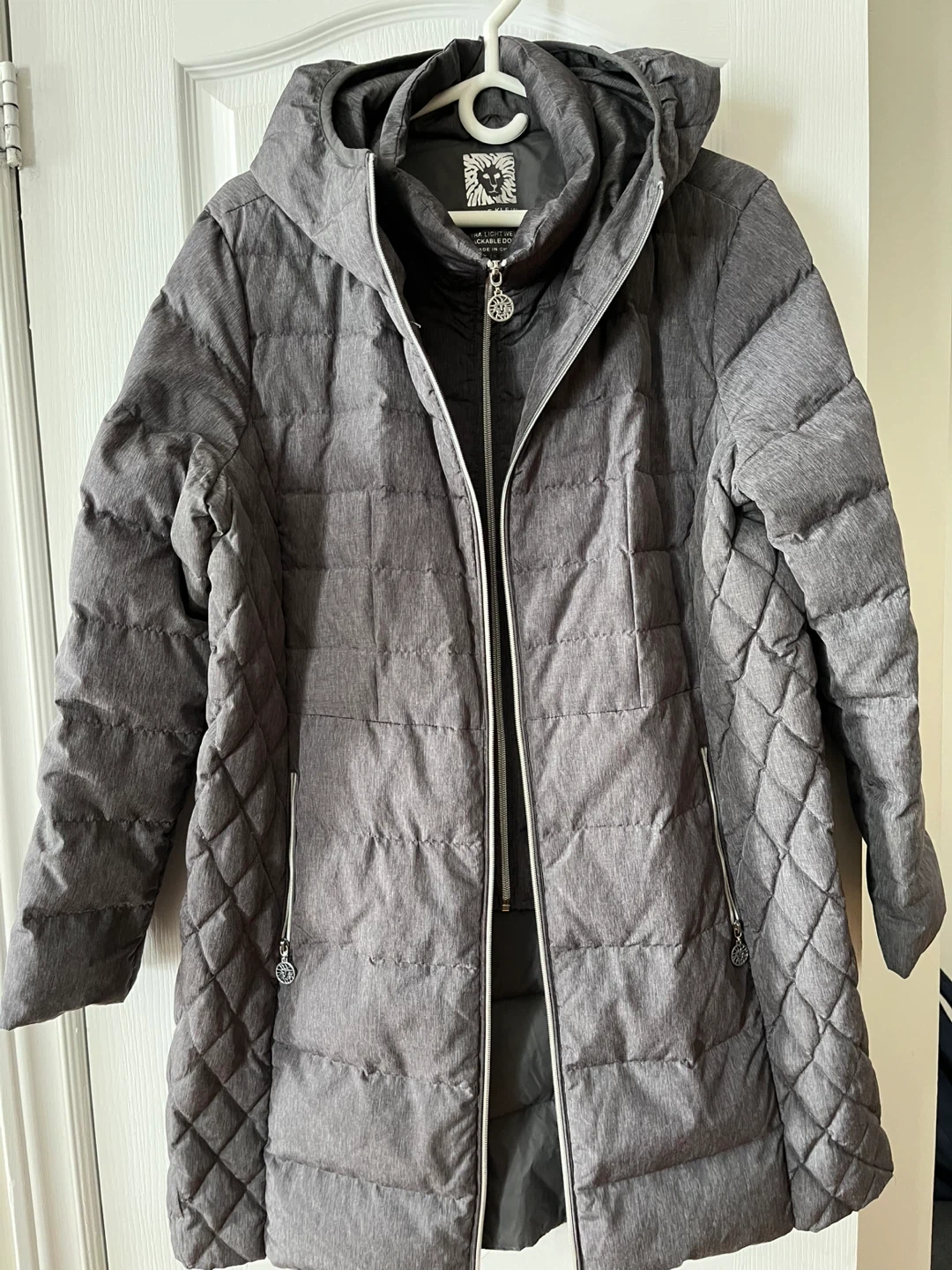 50Selling an Anne Klein coat in size XL. It's a lovely grey colour and is an ultra lightweight packable down coat. Has handy inner attached vest Bottom back seam was re-stitched by hand in a section that lost some feathers. May need to be redone Pick up Markham