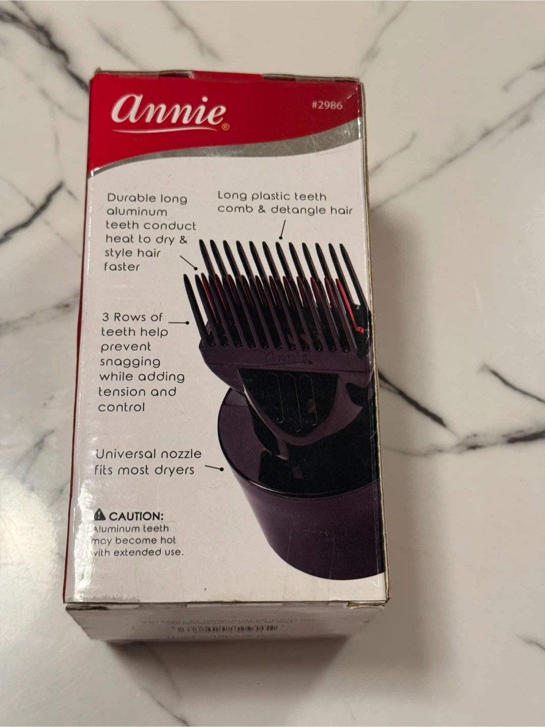 Selling a brand new Annie Universal Detangler Pik Attachment! It features heat conducting aluminum teeth to help dry and style hair faster. The box mentions that it has 3 rows of teeth to prevent snagging while adding tension and control. The universal nozzle fits most dryers