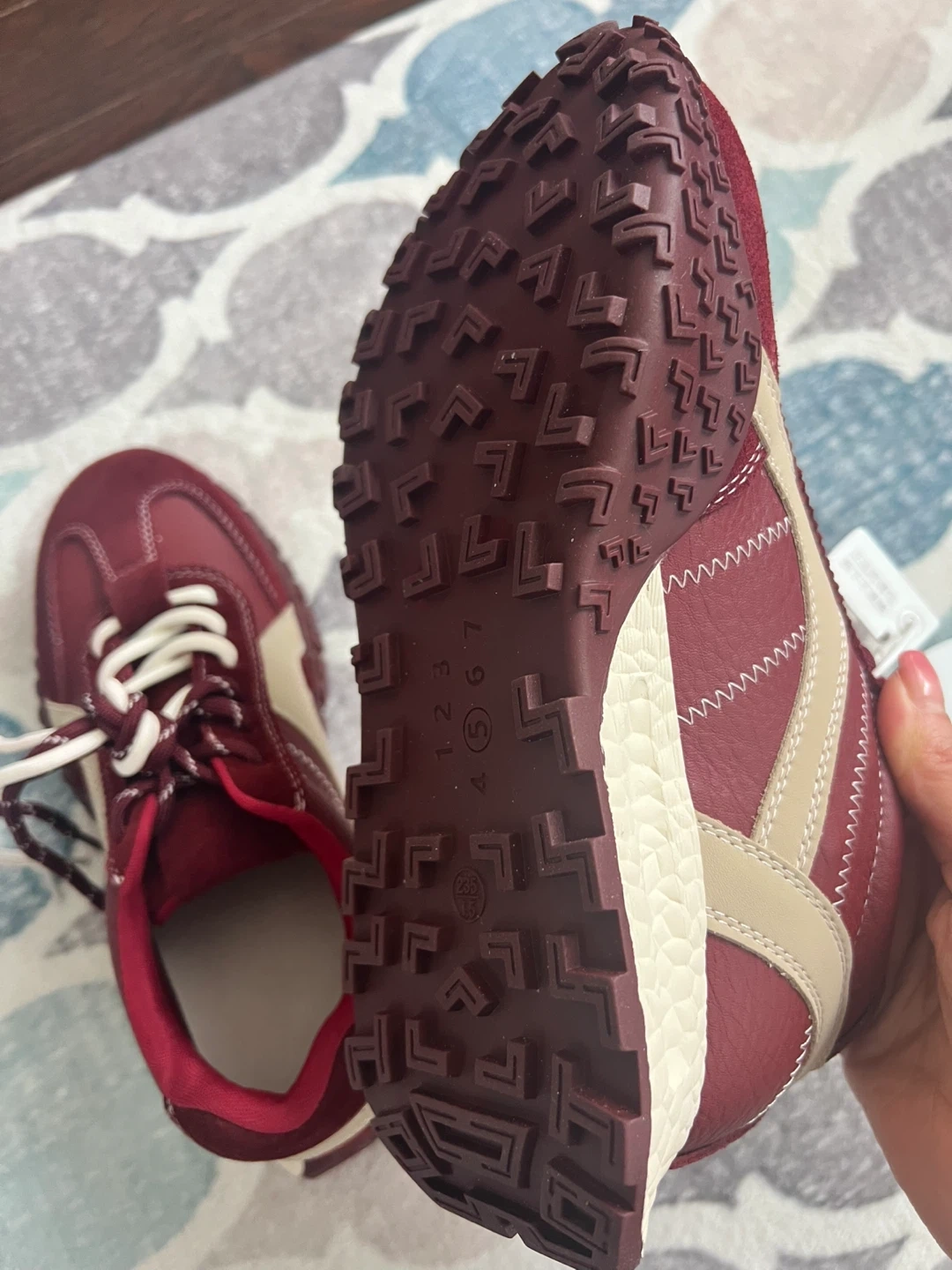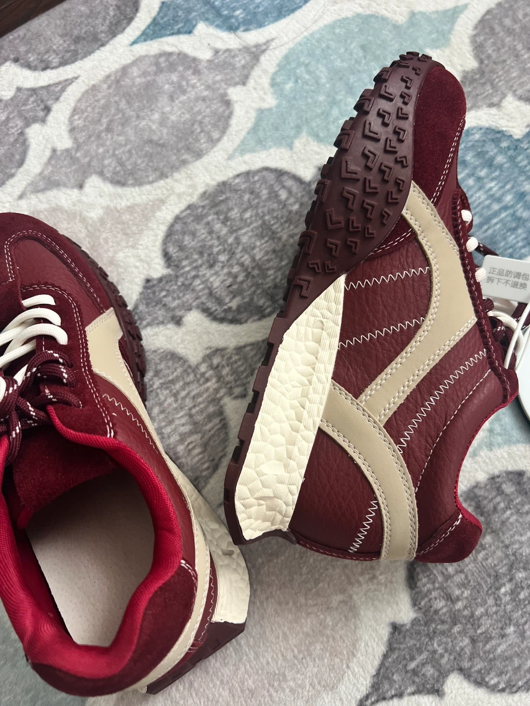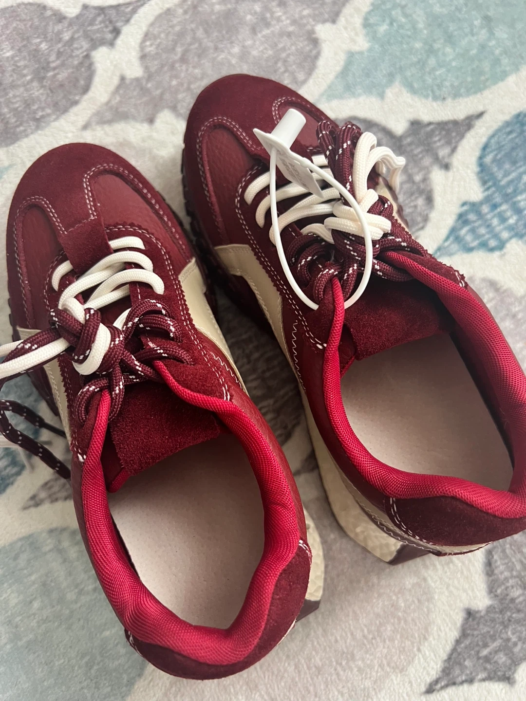 Stylish athletic shoes in a deep maroon and tan colourway. These shoes feature a durable rubber sole and a comfortable interior. Lace-up closure for a secure fit. A great choice for everyday wear or light athletic activities!